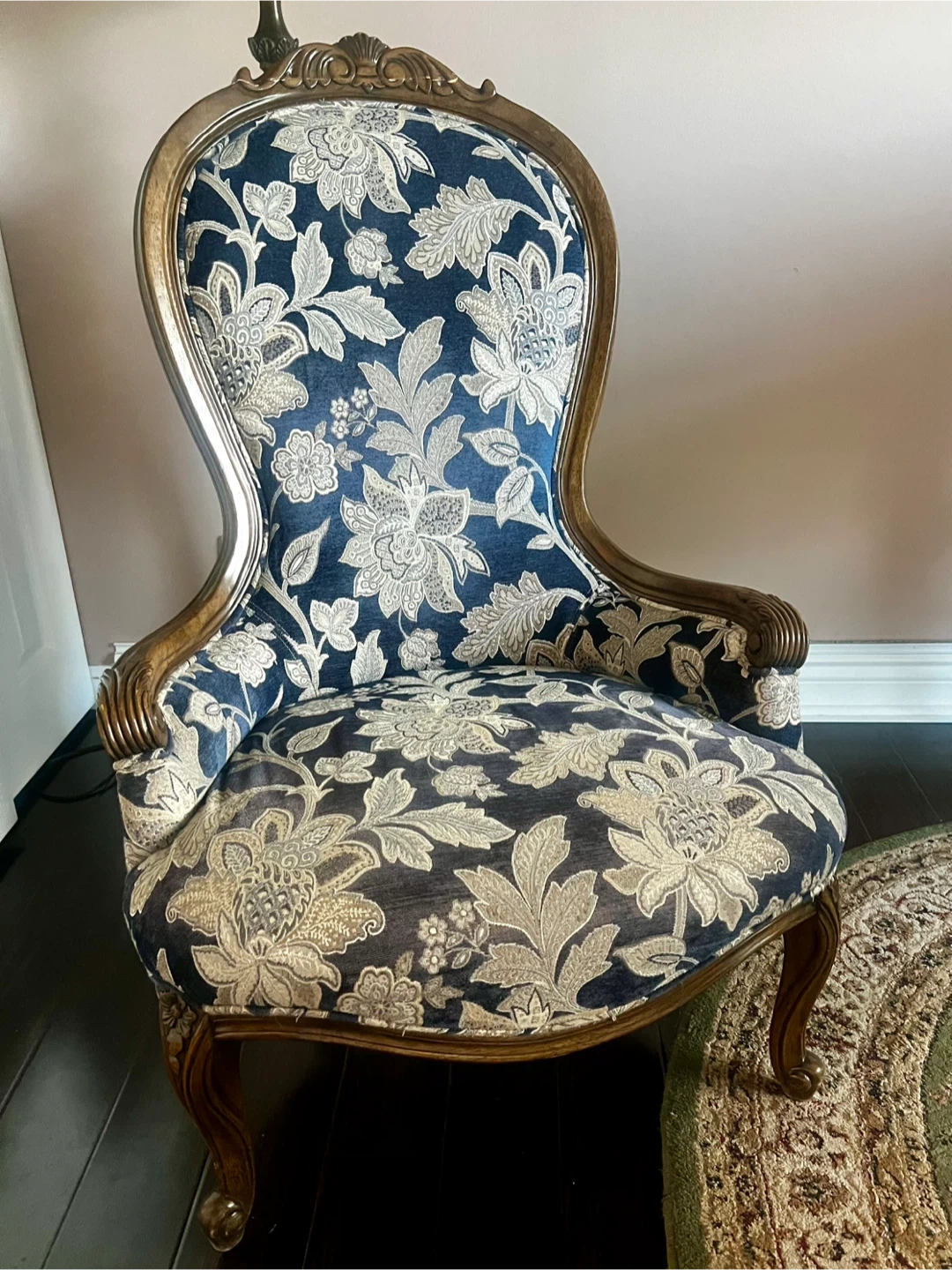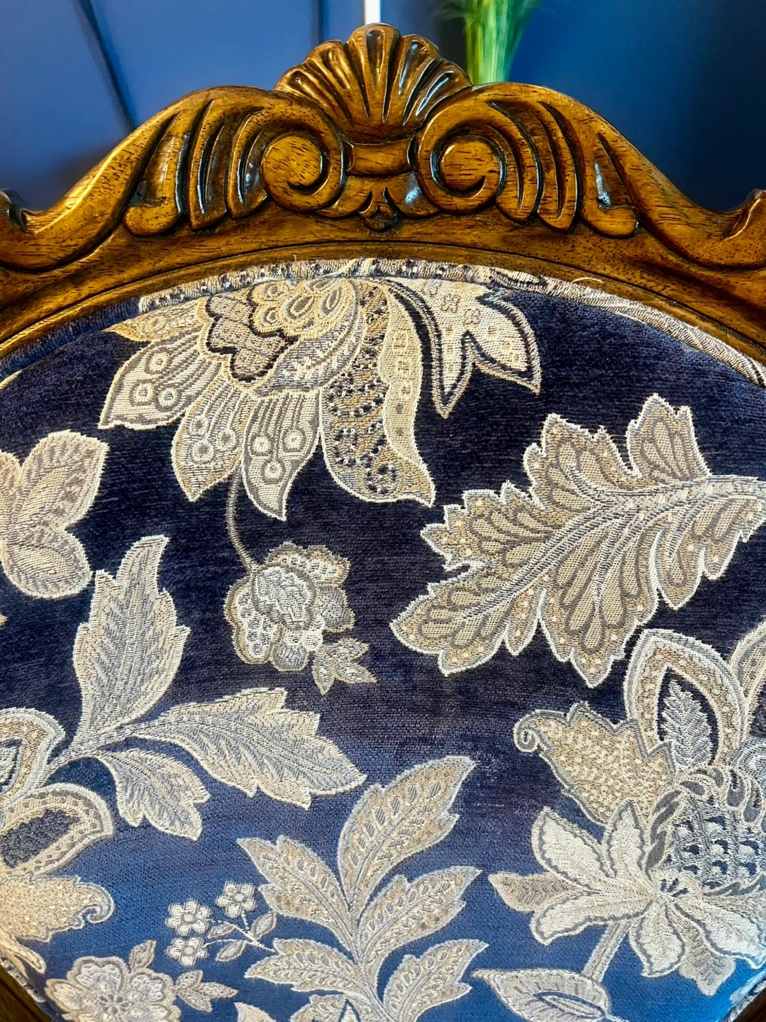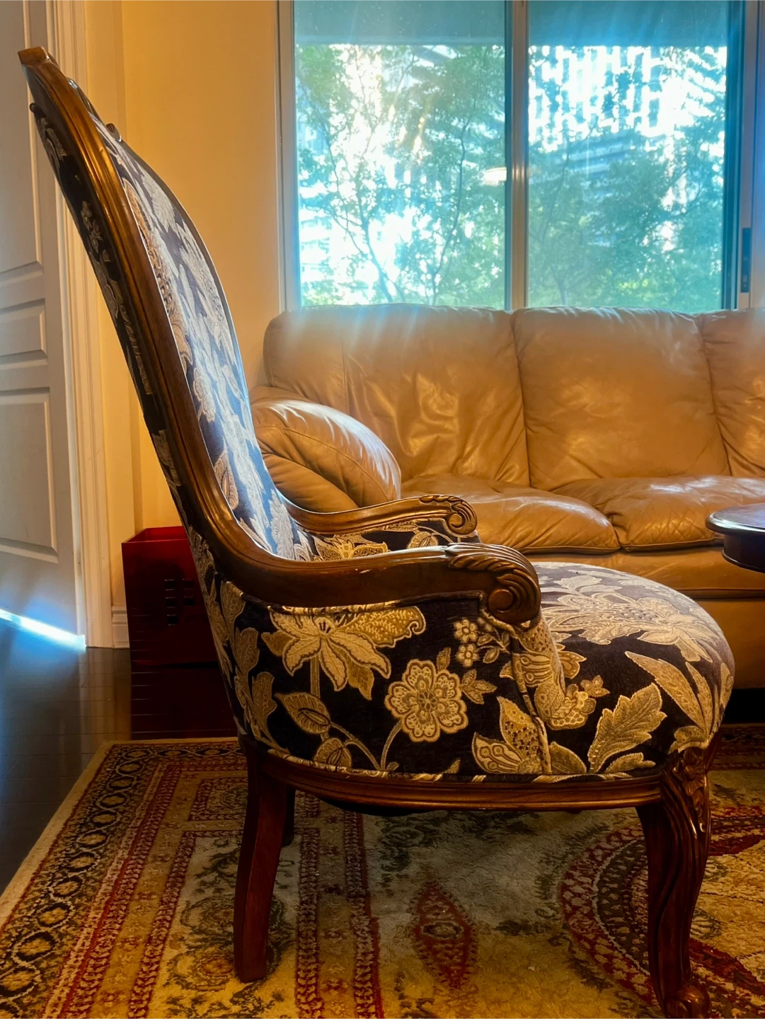 Add timeless charm to your home with this beautiful pair of Bombay accent chairs. ✔️ Solid wood frame with intricate carved detailing ✔️ Upholstered in a rich navy fabric with elegant floral embroidery ✔️ Comfortable high-back design with curved arms ✔️ Excellent craftsmanship, sturdy and stylish ✔️ Perfect for a living room, office, or reading nook 🛋️ Original retail price: approx. $500 each ($1,000 for the pair) 💲 Asking price: $450 for the pair (or $250 each) Condition: Gently used, in great shape Style: Classic/Vintage Bombay Collection
