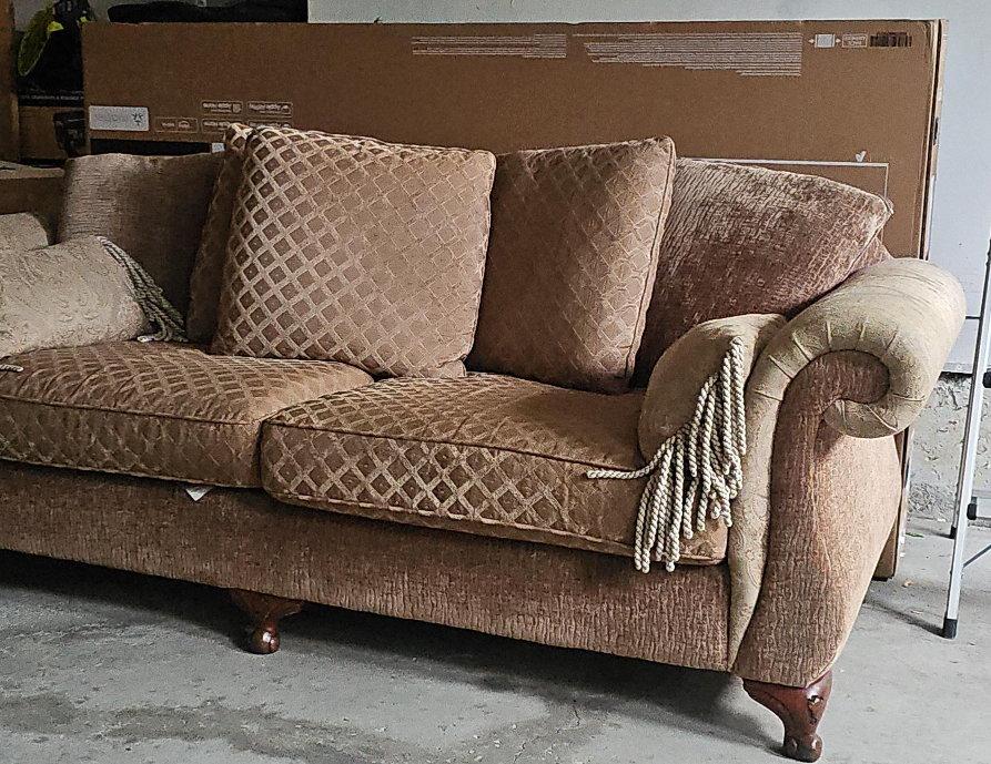 The brown sofa features multiple cushions with a patterned design. Wooden legs and rolled arms offer a classic style. The decorative tassels add a touch of luxury, which could make the sofa a wonderful place to enjoy a quiet afternoon.