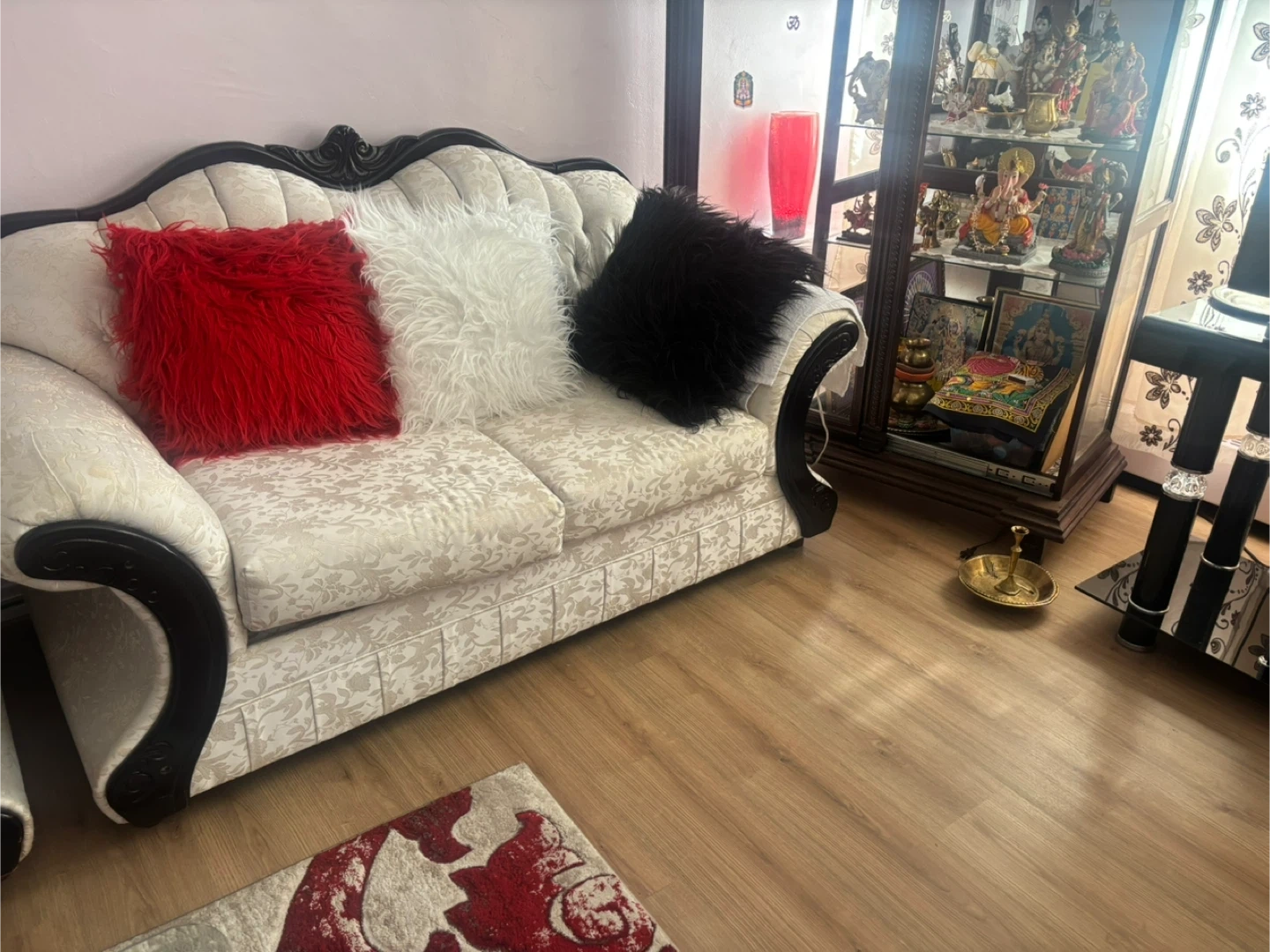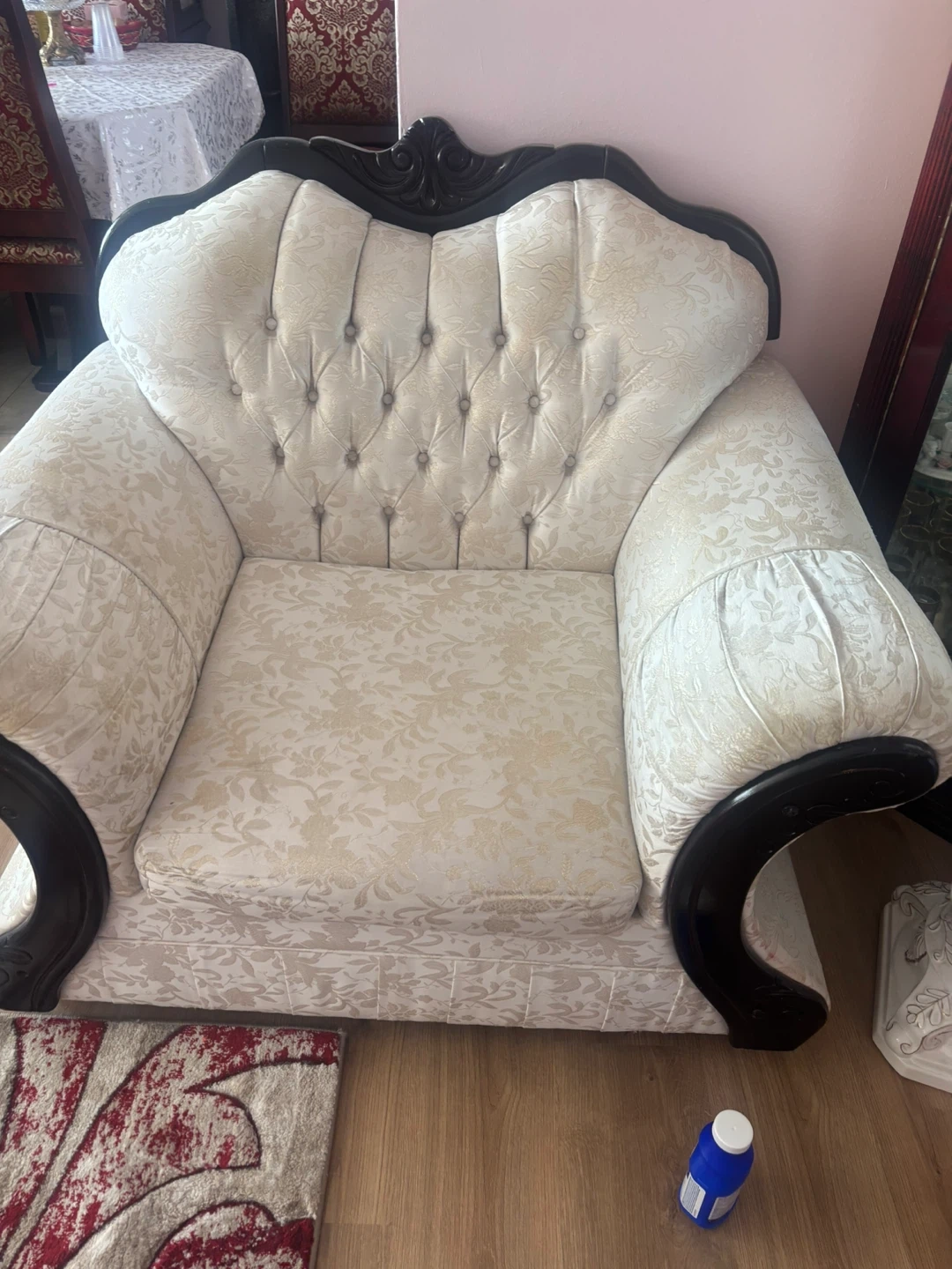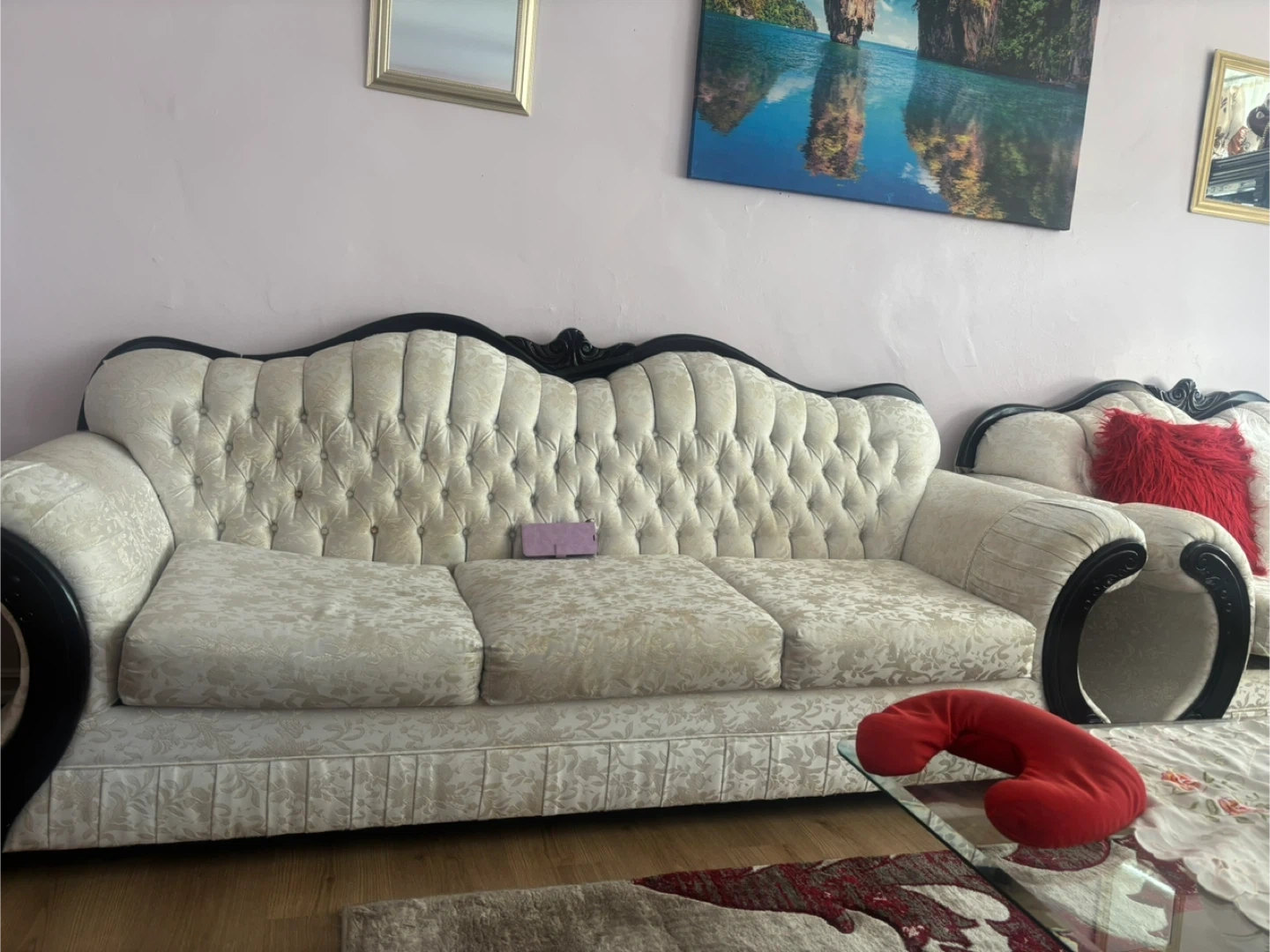 Selling a beautiful cream-coloured sofa set! It features a classic design with dark wood accents. This set is perfect for adding a touch of elegance to your living room. It's in great condition and ready for a new home!