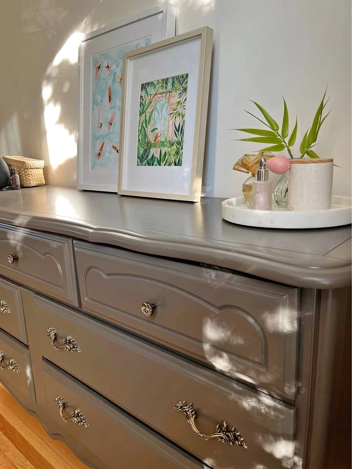 ✨Newly refinished in gorgeous deep grey brown tone✨ The dresser combines beauty, comfort and rustic charm. You could find this dresser in a home on the French country side OR in a massive manor style home. Very versatile… The earthy colour combined with the ornate details gives an effortless balance between cozy and luxury. French provincial is timeless with its ornate carvings, decorative hardware and curved lines. It can easily bring warmth to any room. Brand Les Industries A-P Made in Quebec, Canada This dresser was cleaned, scuff sanded and primed to start with a strong base. Next the dresser was spray painted multiple coat and sprayed multiple top coats for added durability. The drawer glides were waxed, inside of drawers cleaned and drawer stoppers added to protect drawers from scratching the body. Lastly the hardware was added for finishing touches! 😘 Dimensions 64” W 31.5” H 18” D in Pickup around Bayly & Liverpool.