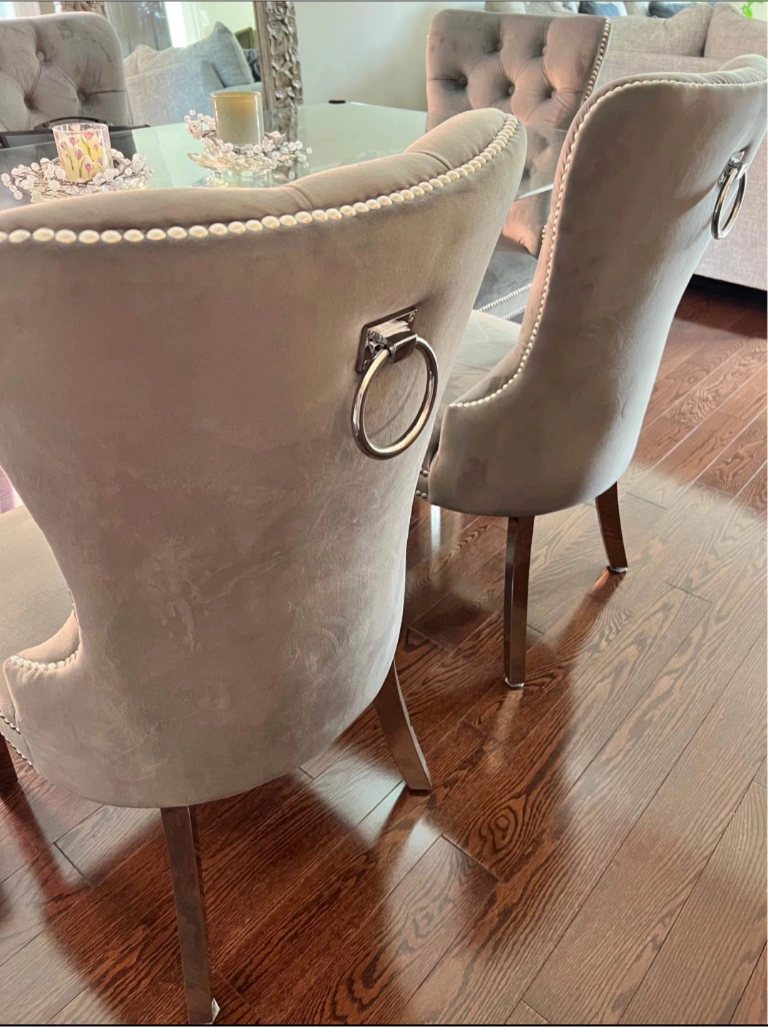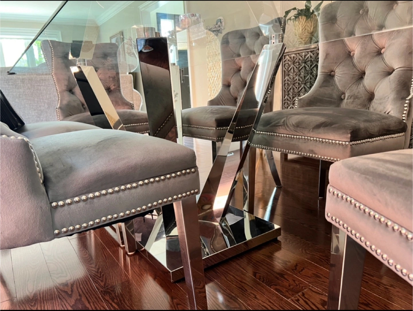 10Almost new! Gorgeous 6-piece modern dining set in excellent condition! • Tempered thick glass top with a stunning chrome sculptural base • 6 tufted velvet chairs in a soft grey tone with chrome ring pulls and nailhead trim • Elegant and timeless design – adds a luxurious touch to any home • Seats 6 comfortably • From a smoke-free, pet-free home Will throw in wooden legs (unused) for the 6 chairs, for free.