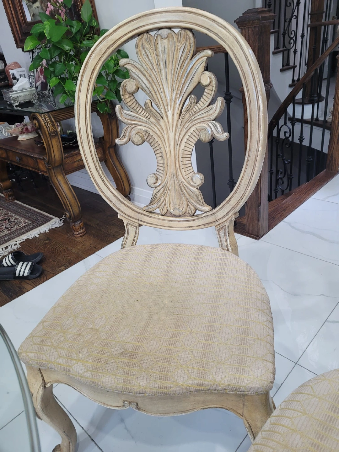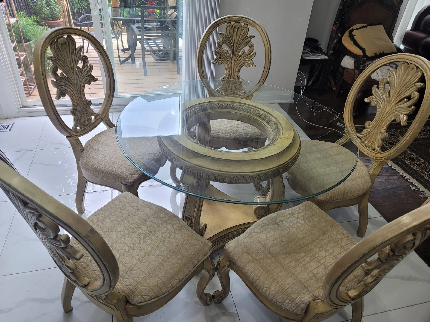 Beautiful round glass-top dining table with 5 matching chairs. The set features an ornate carved pedestal base and chairs with elegant leaf-pattern backs. Upholstered seats are comfortable and sturdy. Glass: Comes with 2 round glass top (one is 48” and the other is 56" in diameter) Table: Decorative carved base Chairs: 5 matching chairs with carved backs and cushioned seats Perfect for a dining room, kitchen, or breakfast area – brings a touch of elegance to any space. Pick-up only (Richmond Hill - Near Leslie & 16th Ave). Contact: Please message through Kijiji to arrange a viewing or ask questions.
