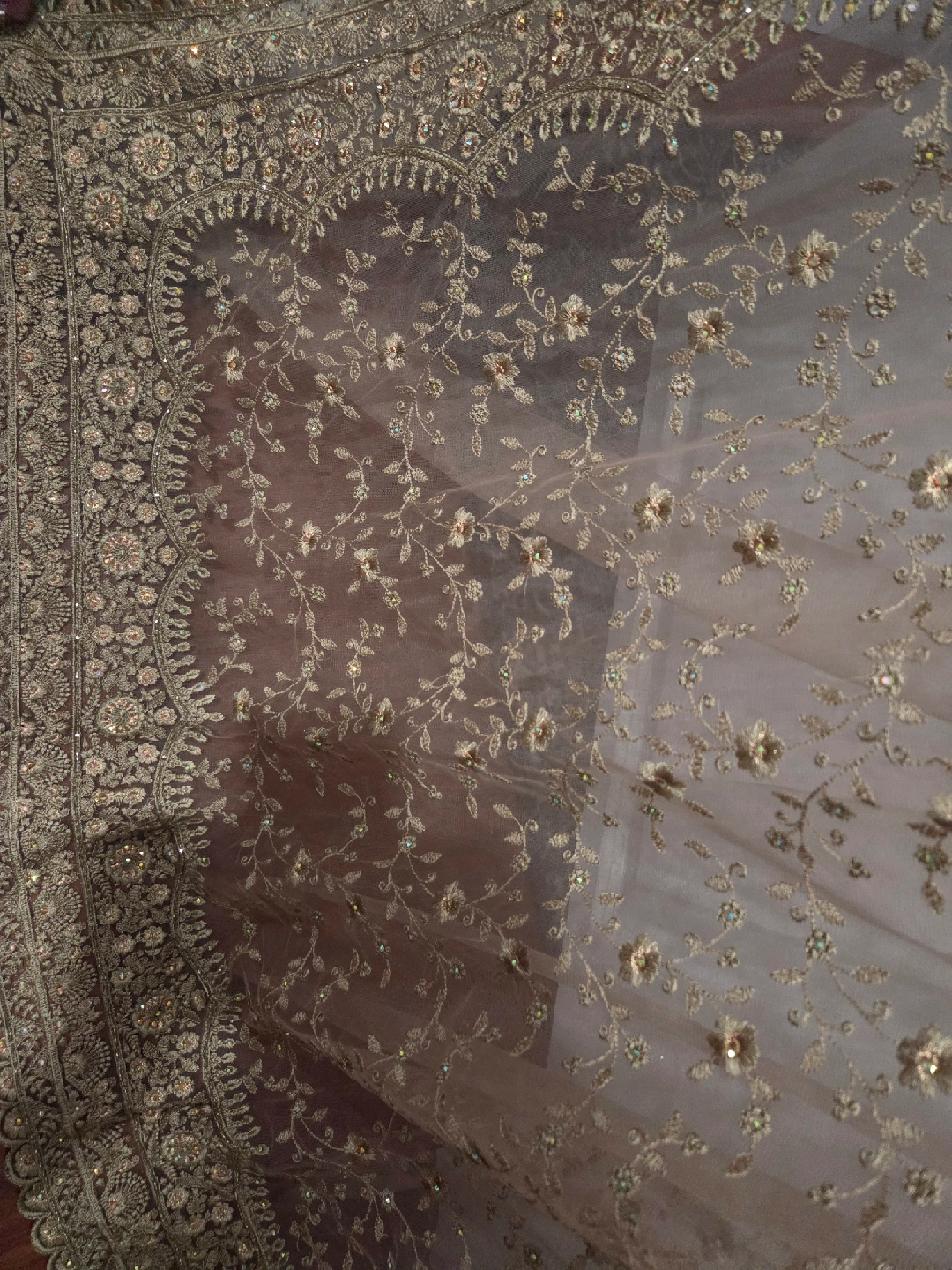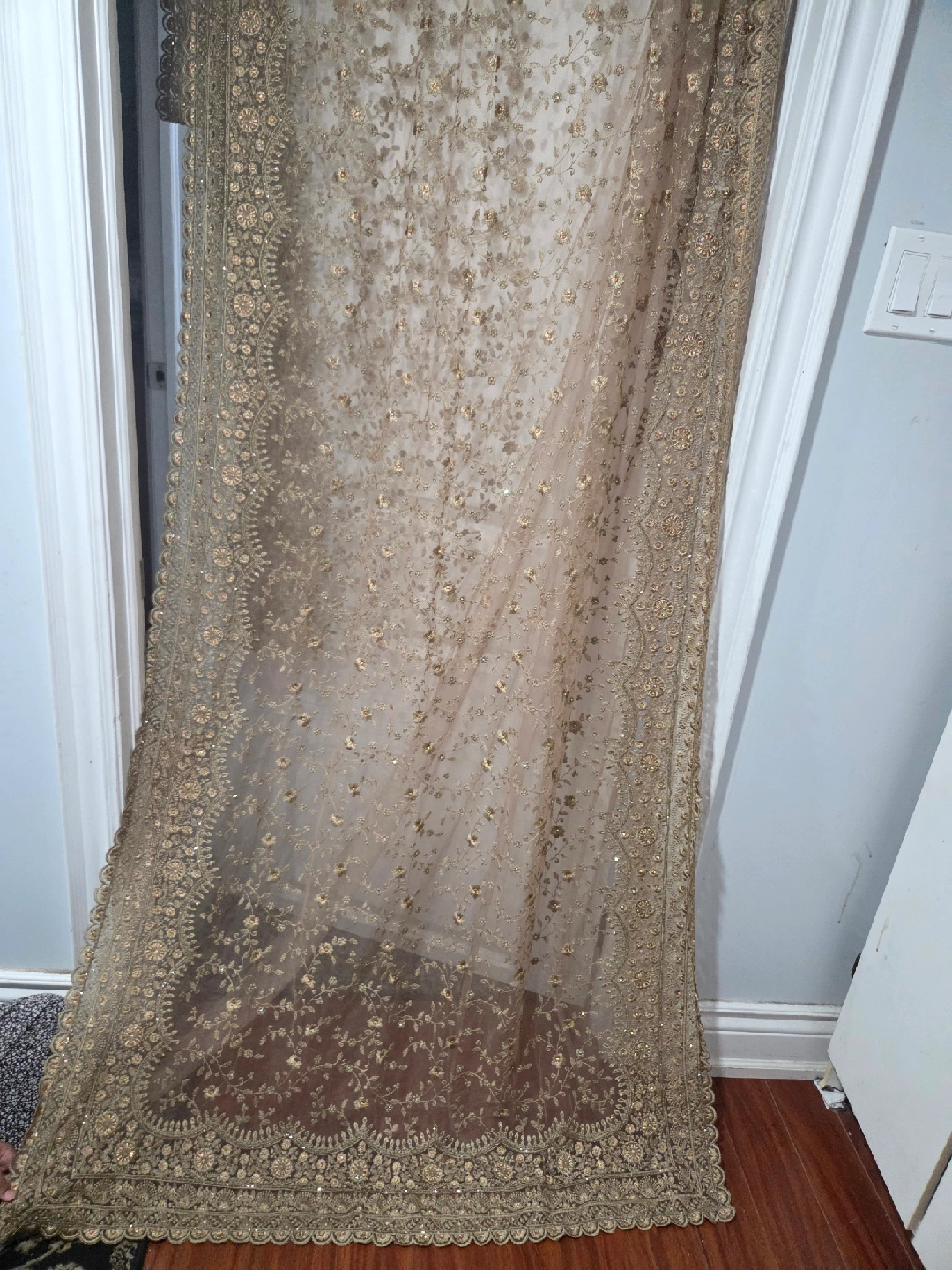 Beautiful golden net saree with heavy embroidery and intricate border work. Perfect for parties, weddings, or special occasions. Condition: Brand New Color: Golden Fabric: Net with detailed embroidery