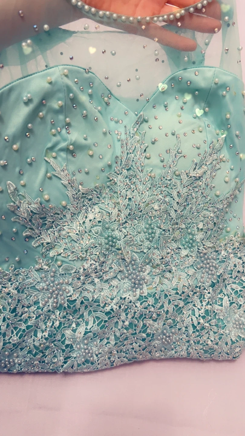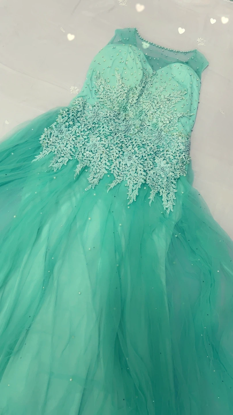 10Selling a beautiful green dress with intricate floral lace and pearl embellishments. It's in great condition and would be perfect for a special occasion!