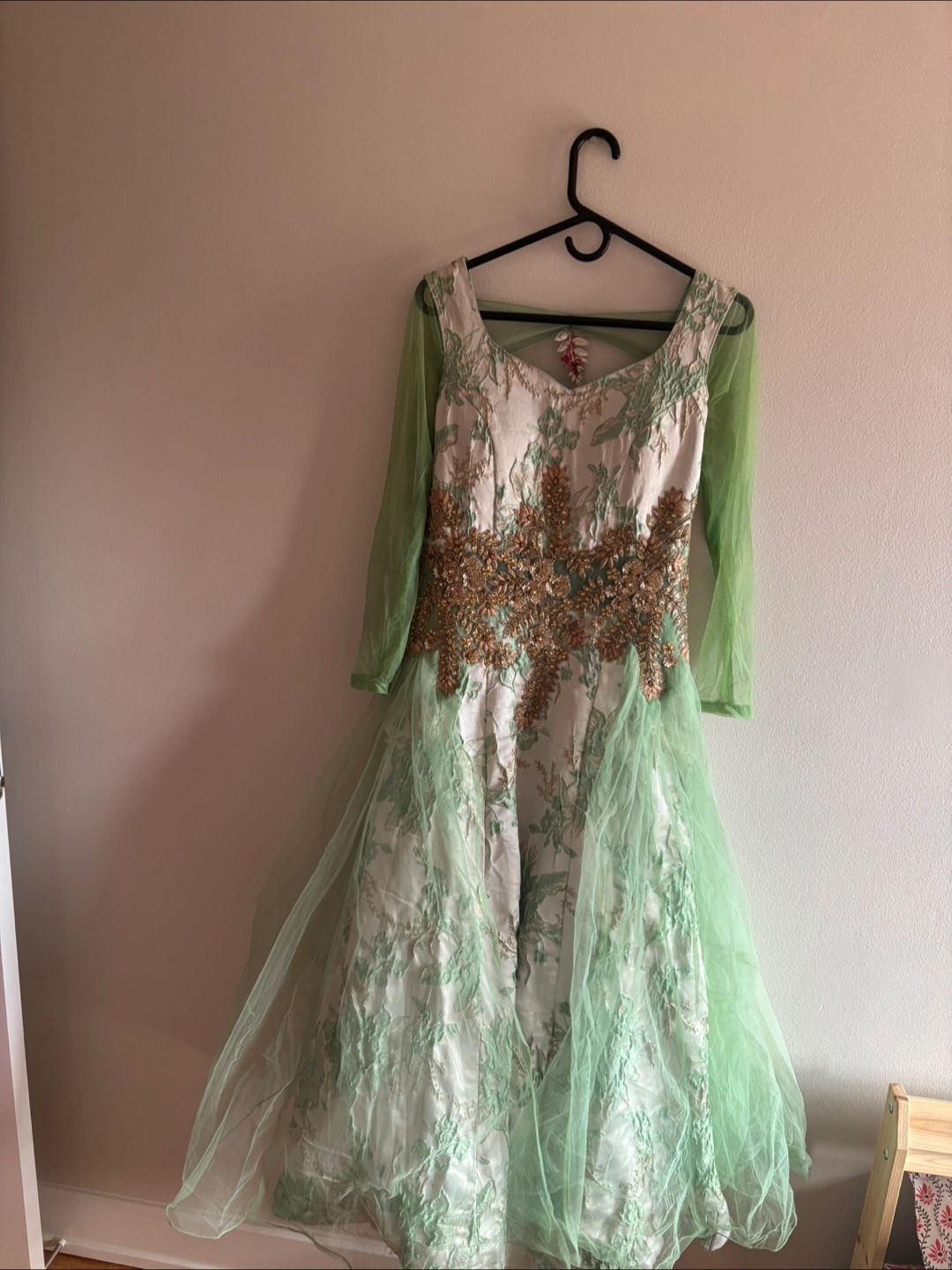 Beautiful dress with green sheer sleeves and a layered skirt. The bodice has intricate gold embellishments. Perfect for a special occasion!