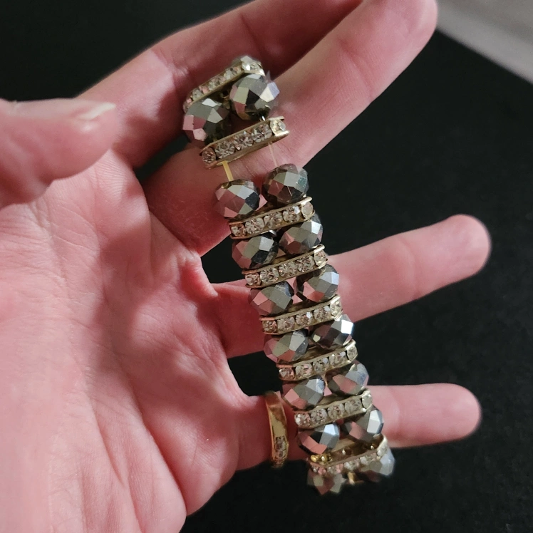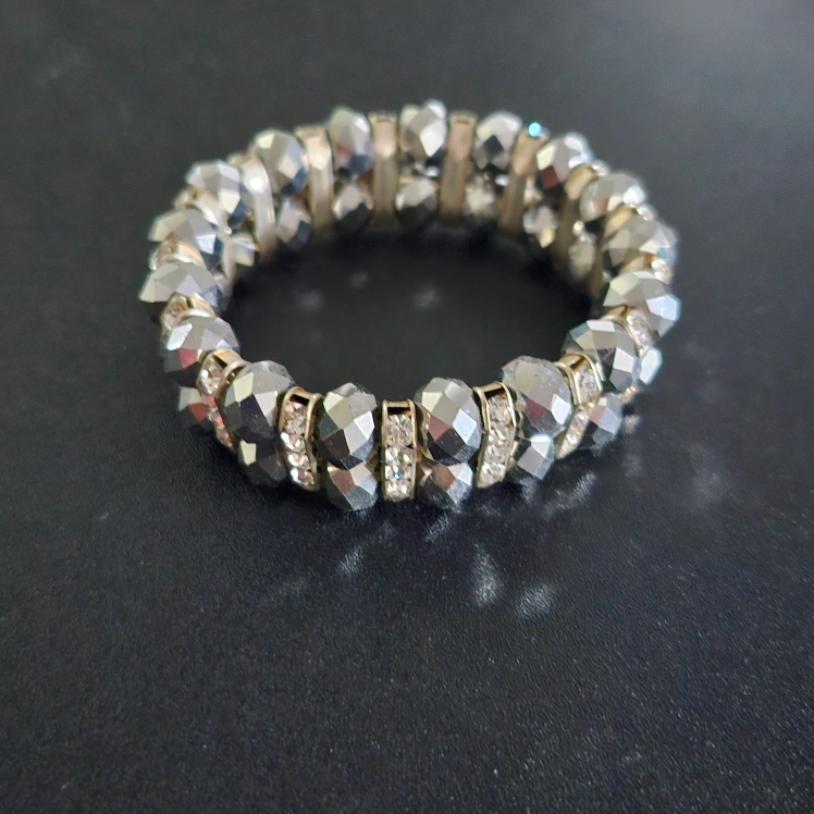 Gorgeous bracelet featuring grey faceted beads and clear rhinestones. Stretch design for easy on and off. Perfect for adding a touch of sparkle to any outfit.