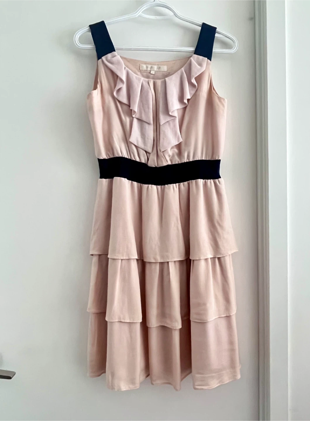 Light pink dress with soft ruffle details and layered skirt. The colour is muted with a subtle sheen. This dress comes in a soft blush pink (close to Indian pink), with a navy waistband and straps. 📍Material: Rayon outer fabric, polyester contrast details, and fully lined in polyester 📍 Condition: Gently used Easy to dress up for a party or dress down for daily use. 📍Only cash and Pick up 📍No Return. Check out my other listings😊
