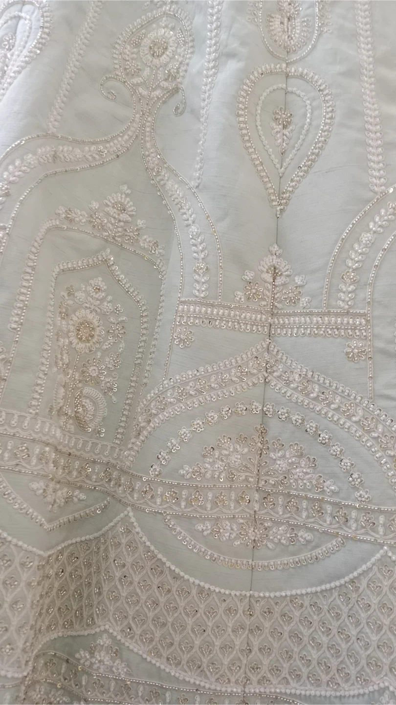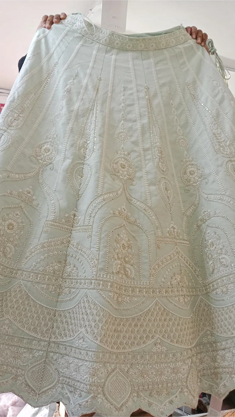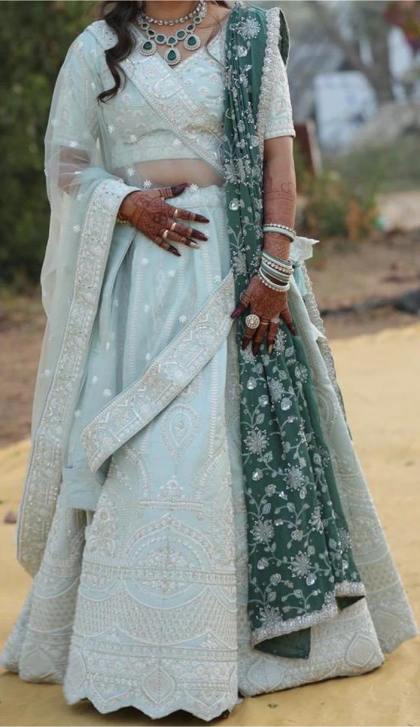 Selling a beautiful lehenga choli set. The lehenga is a light blue colour with intricate white embroidery. It comes with a contrasting green dupatta. Perfect for weddings or special occasions!