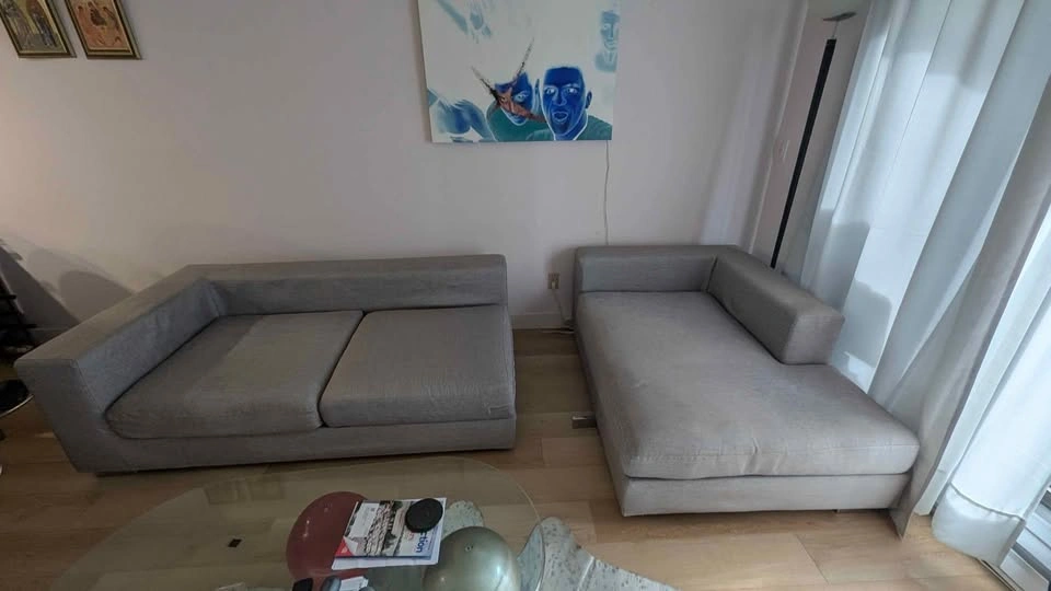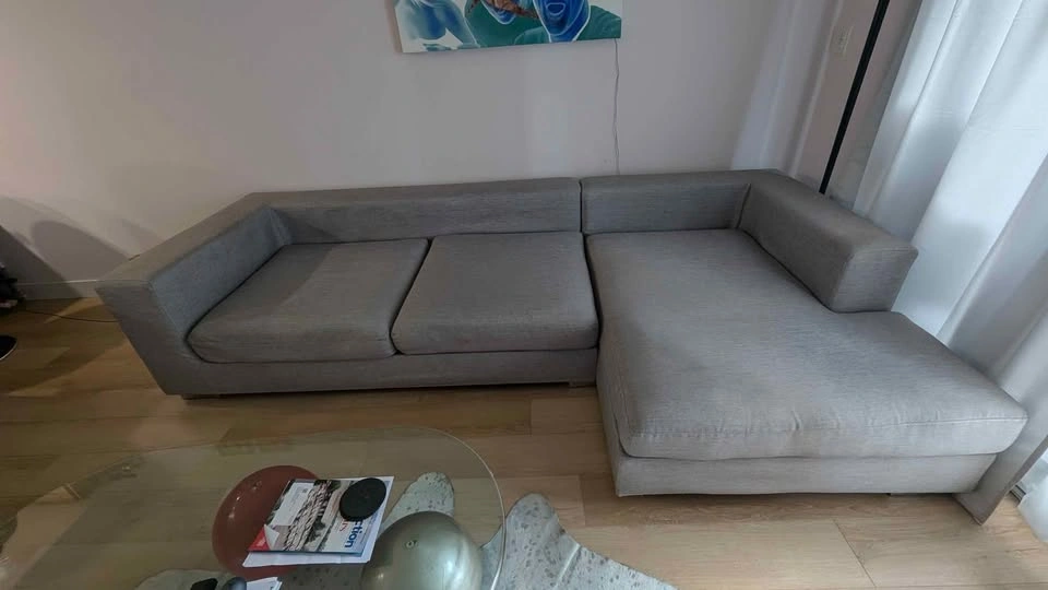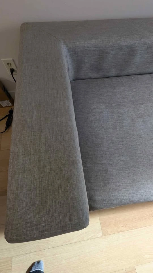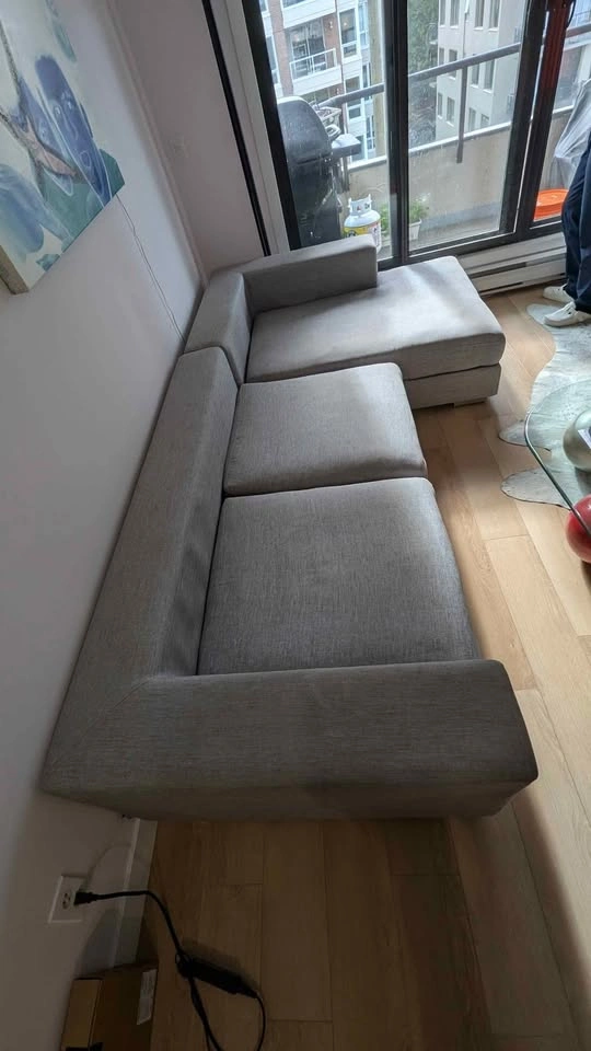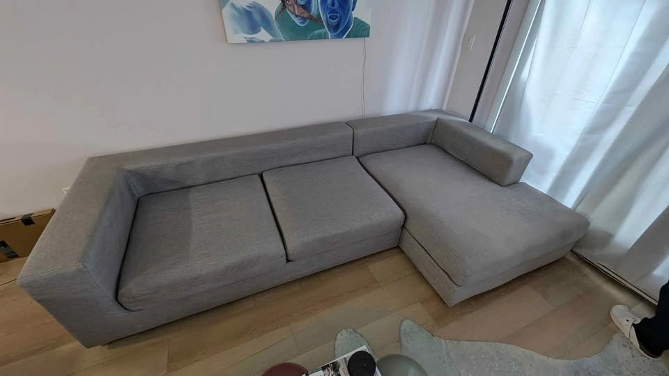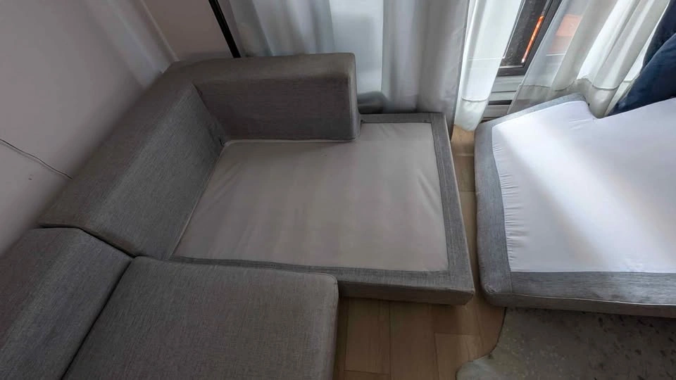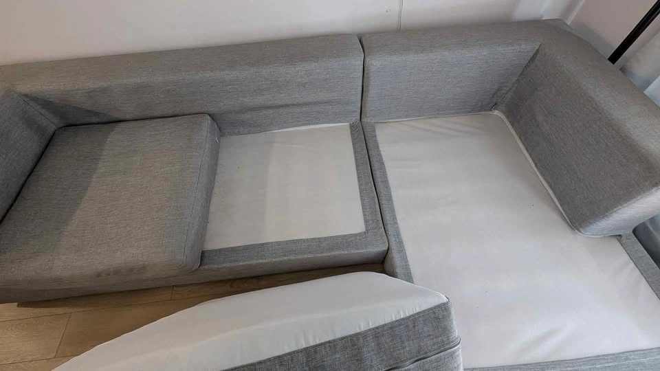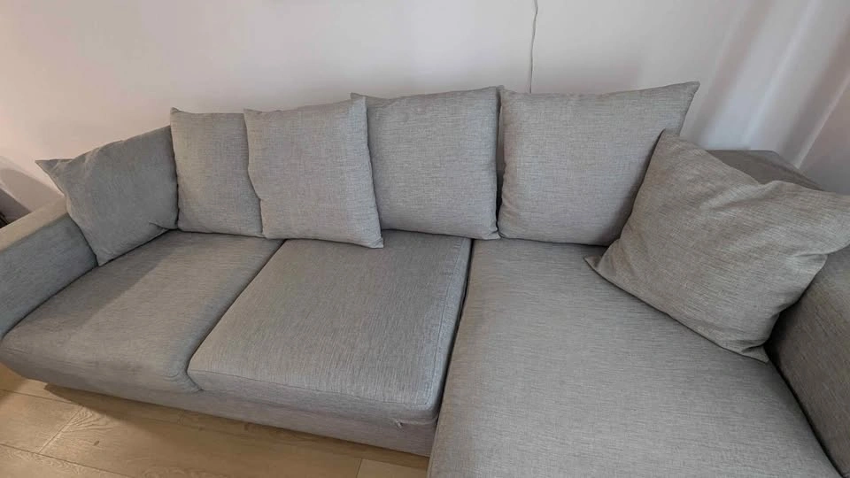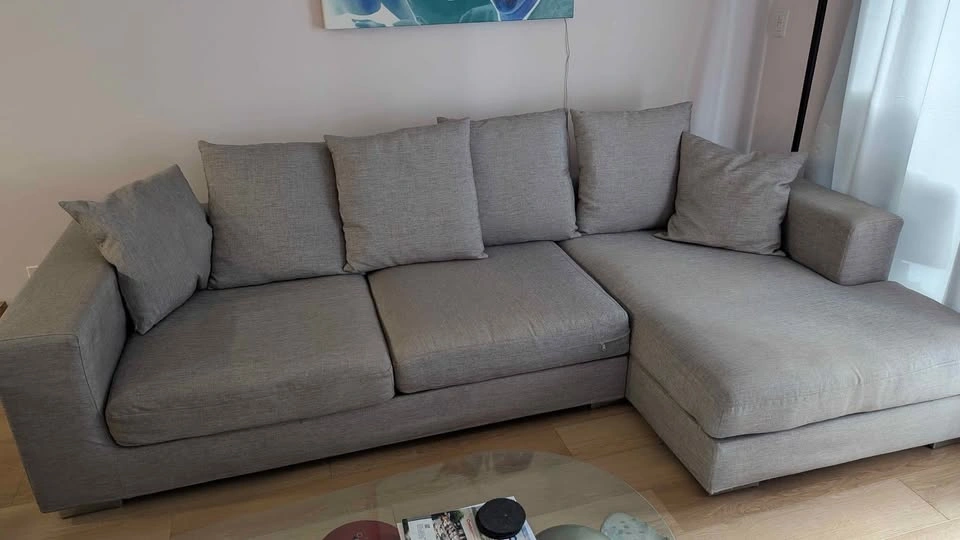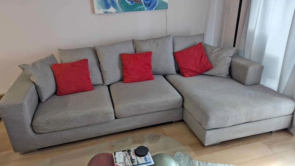 15I have had this sofa for just over a year now. Barely used. In good condition, no stains or scratches. The fabric is intact & is in great condition as well. The filling is the foamy type of sponge. Cushions are firm and comfortable sitting. Extremely comfortable for sleeping as well. The Cover of the seat cushions & throw over cushions can be removed for washing. 6 large throw over cushions & 3 small red decorative cushions. L - Shaped (Separate piece) Measurements L 58inch W 41inch H 24inch Whole Sofa measurement L 112inch W 40inch H 24inch