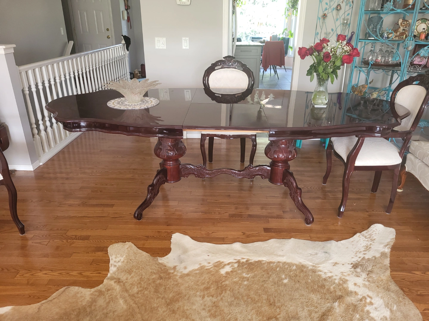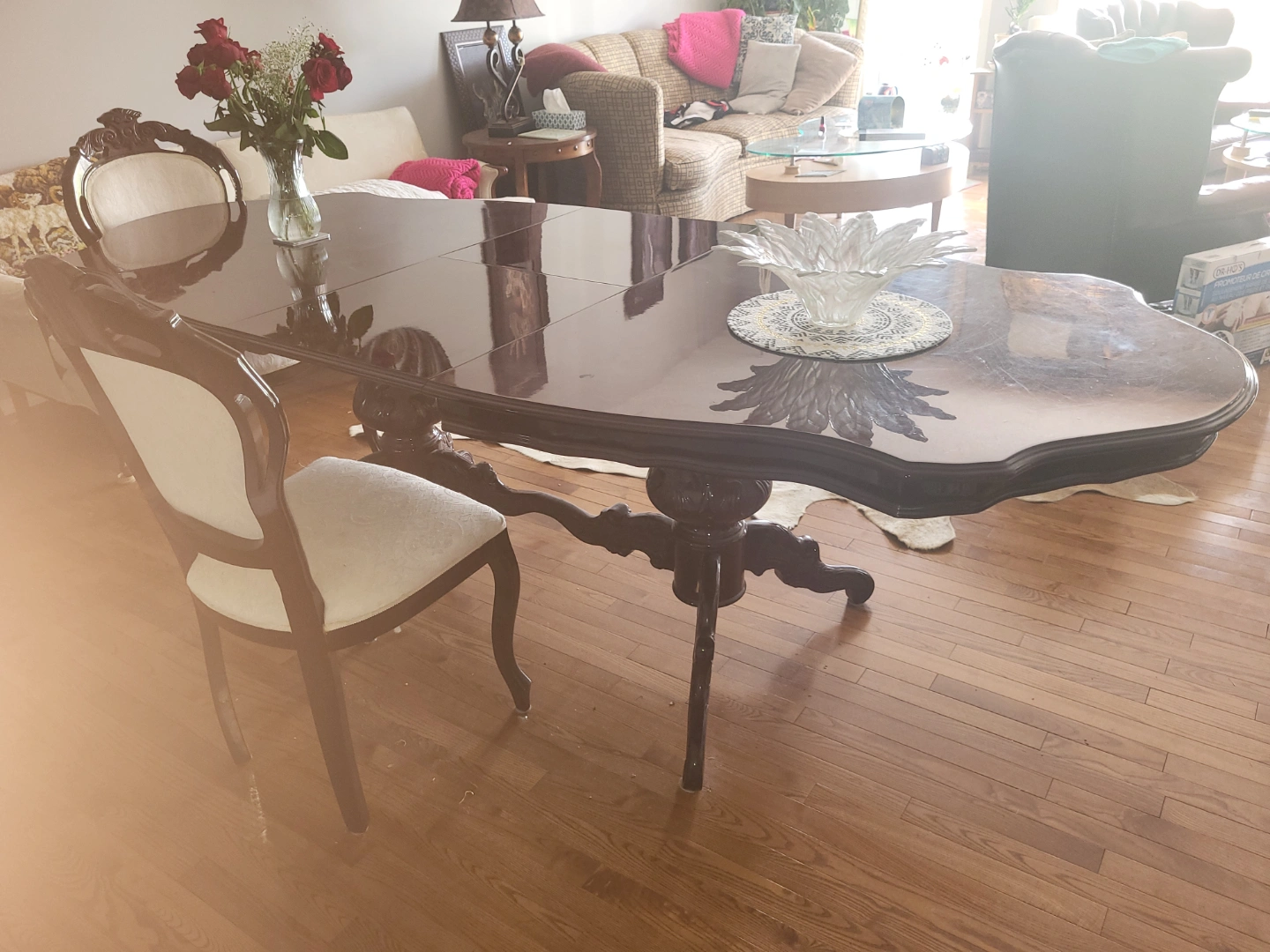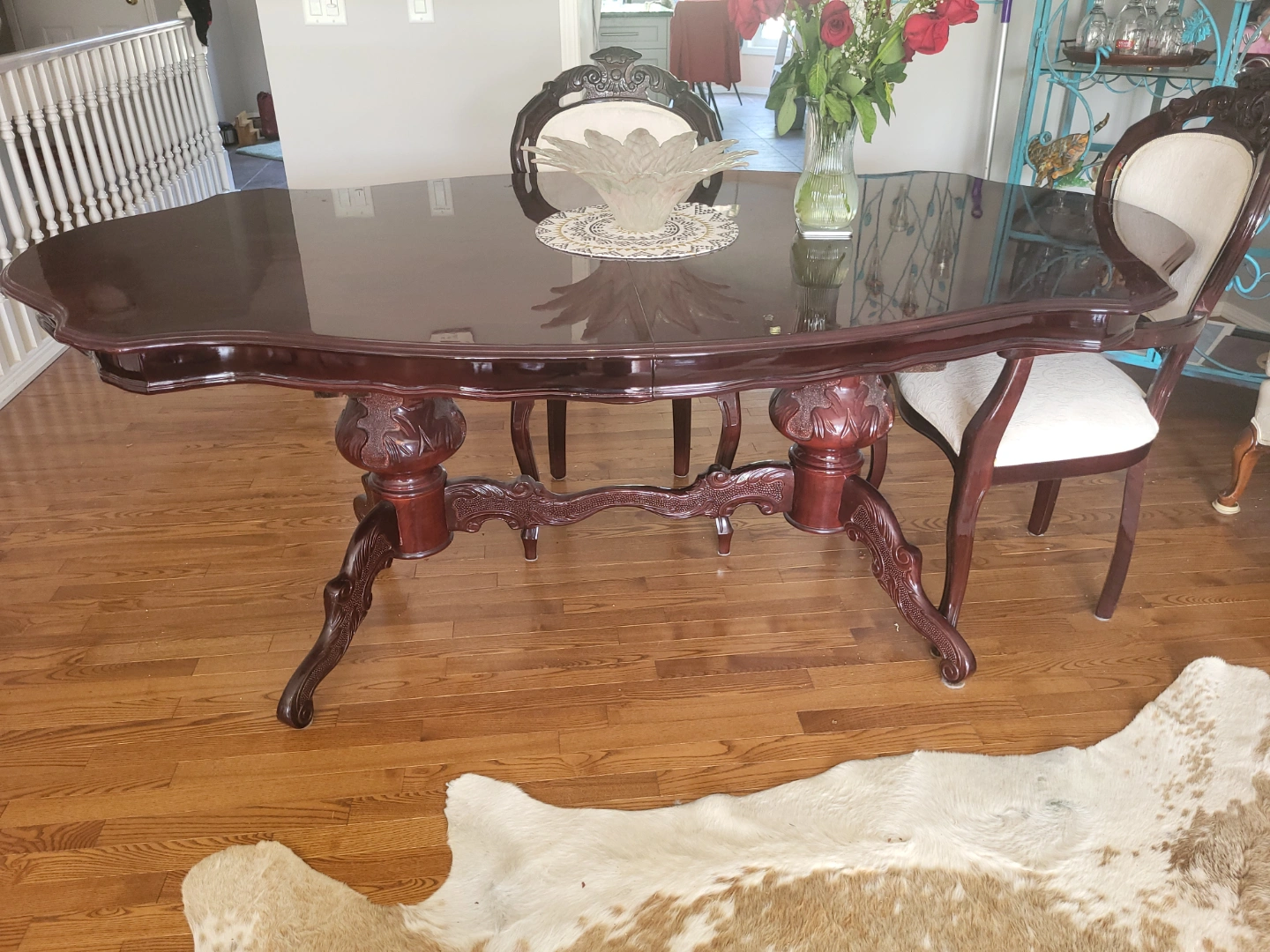 Beautiful Italian solid mahogany wood extending dining table. Features high gloss, oval top and ornate, double pedestal carvings. Includes six matching chairs with off-white upholstery. Table extends to accommodate more guests, using a built-in hidden panel. Solid mahogany wood construction.