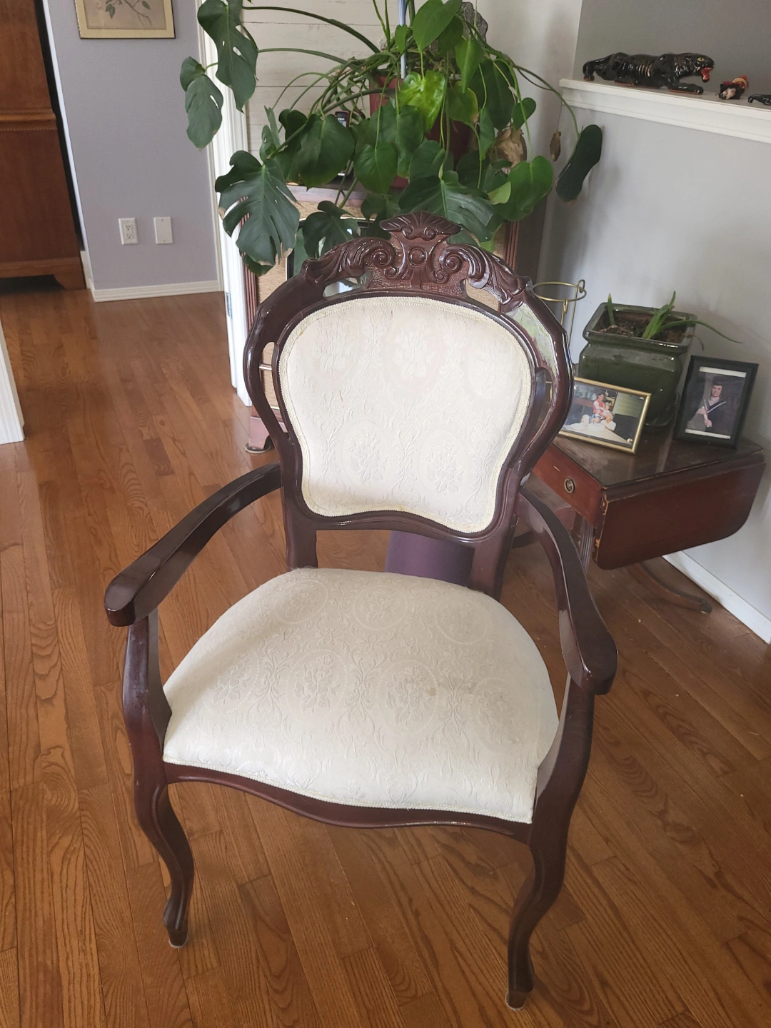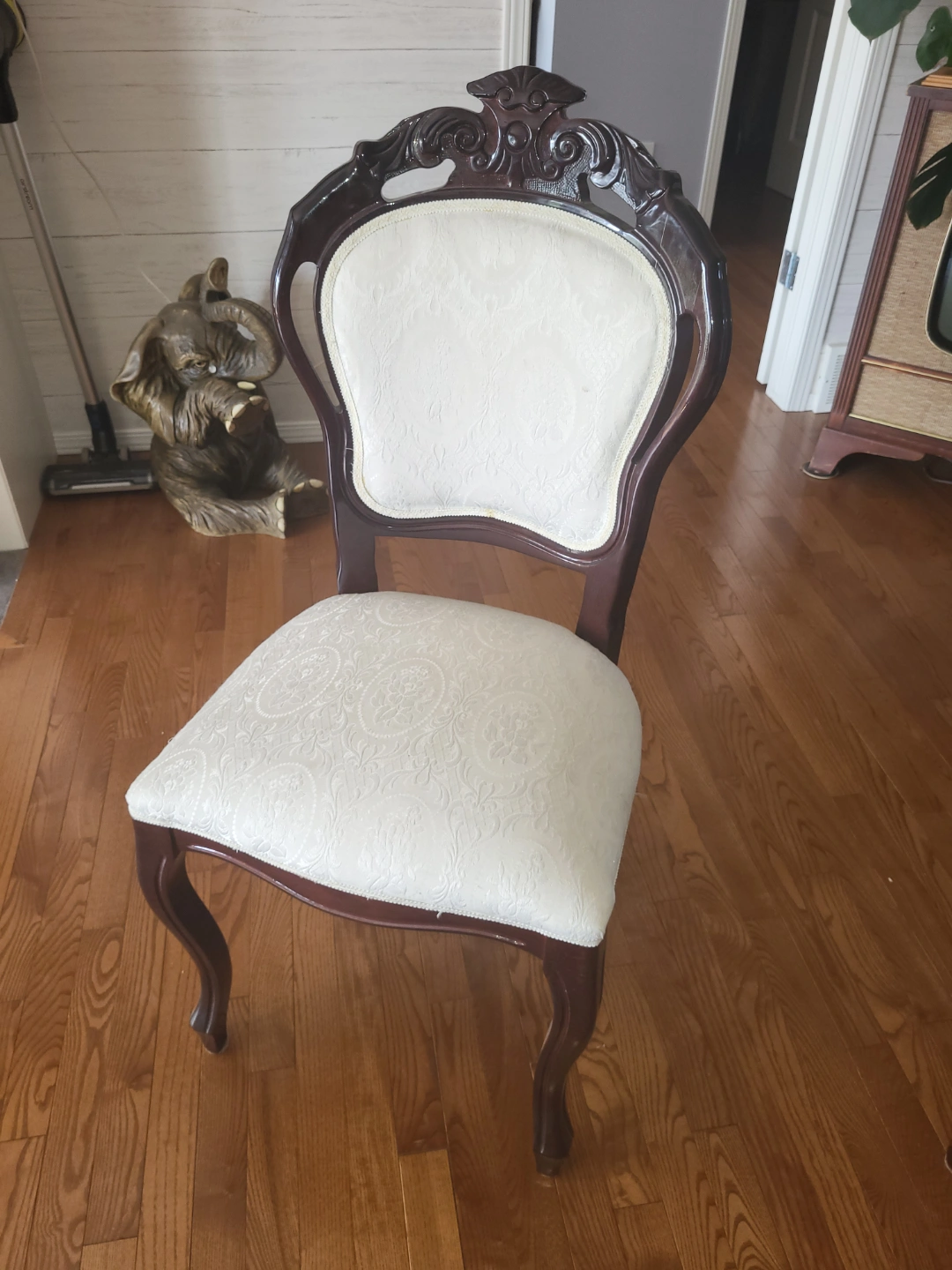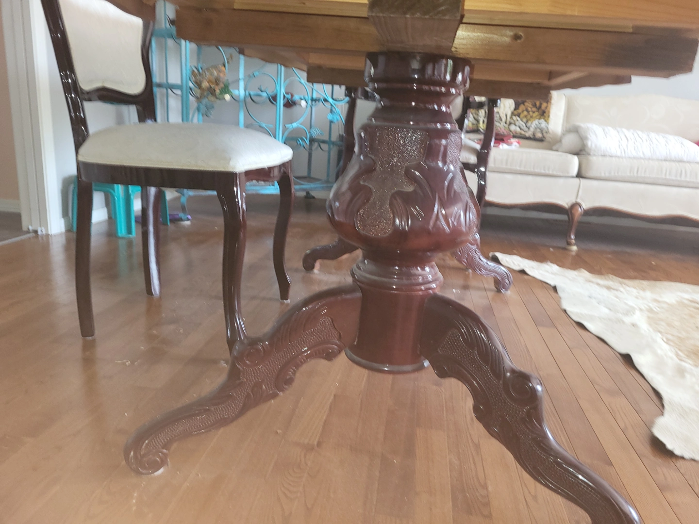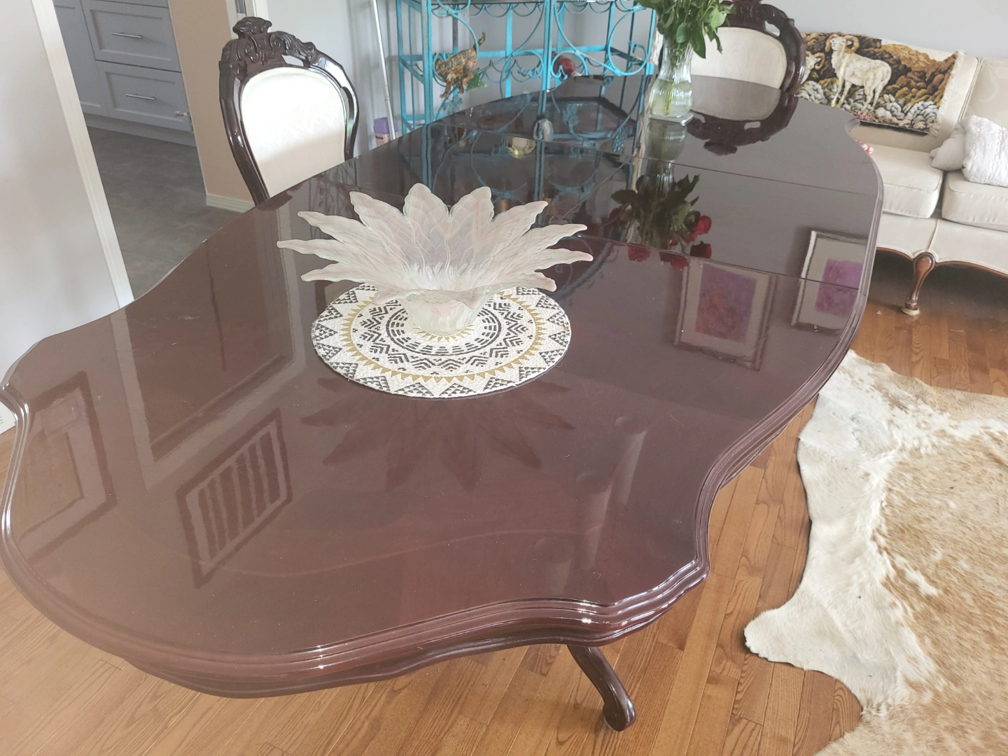 Beautiful Italian solid mahogany wood extending dining table. Features high gloss, oval top and ornate, double pedestal carvings. Includes six matching chairs with off-white upholstery. Table extends to accommodate more guests, using a built-in hidden panel. Solid mahogany wood construction.