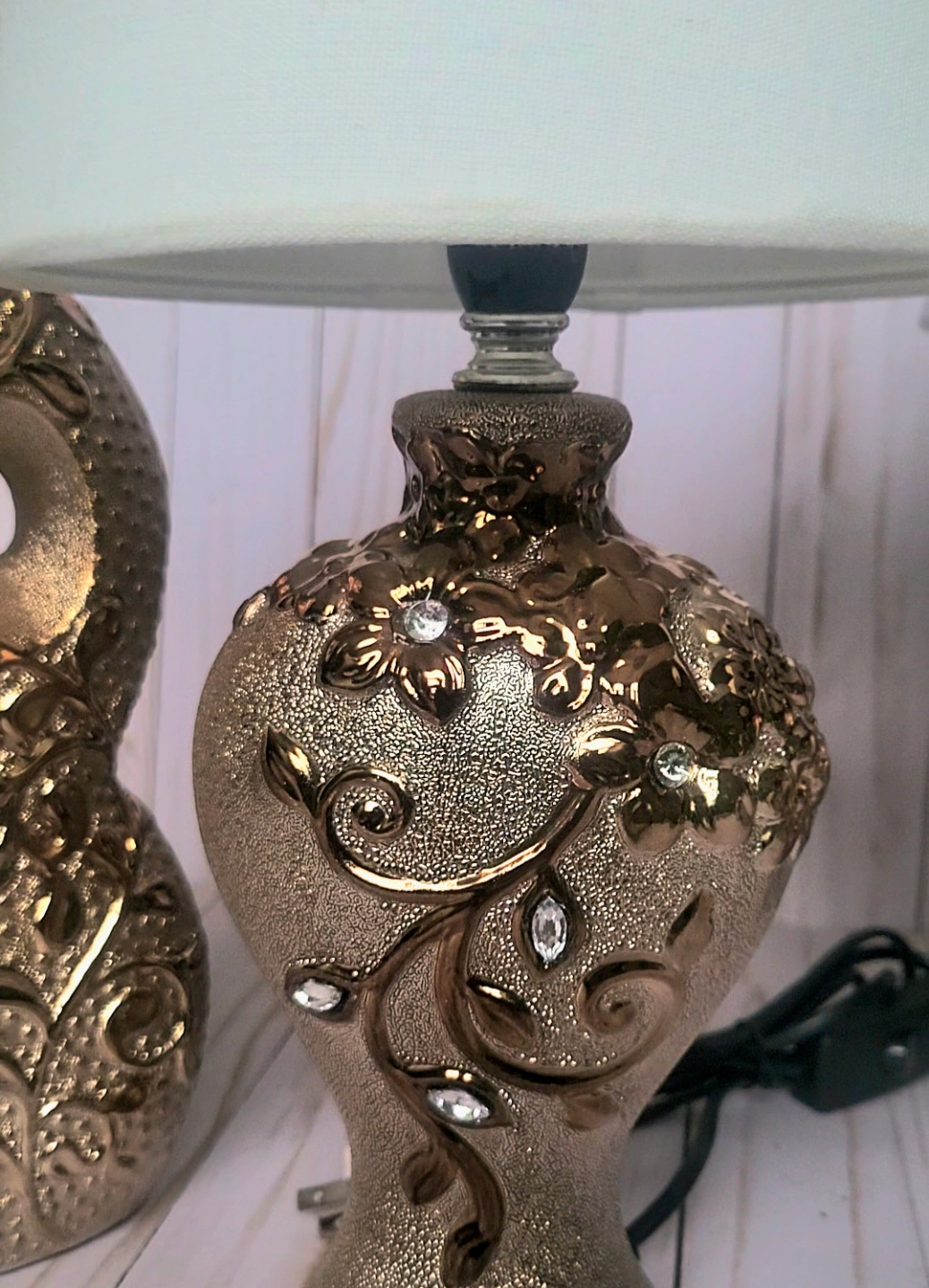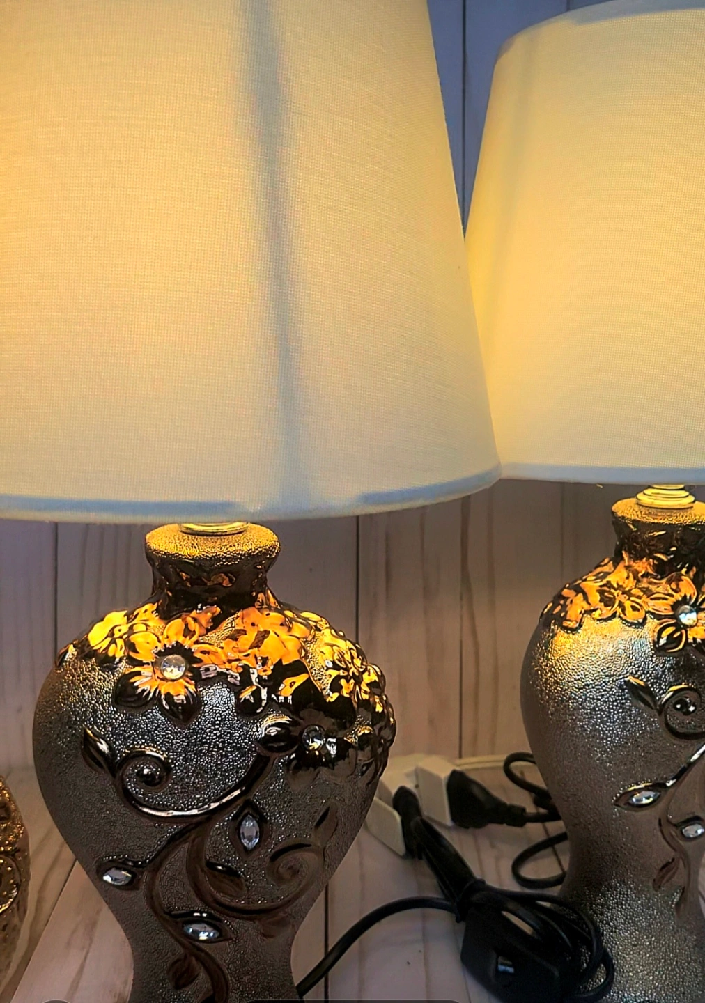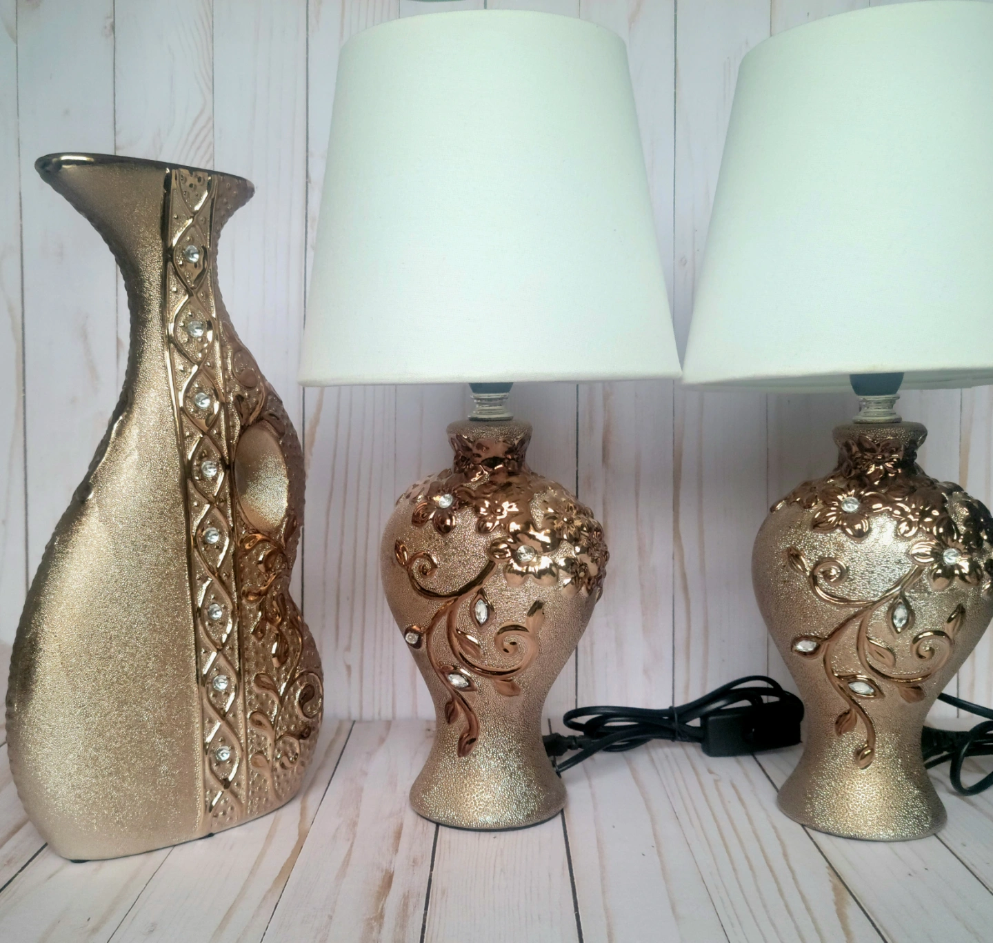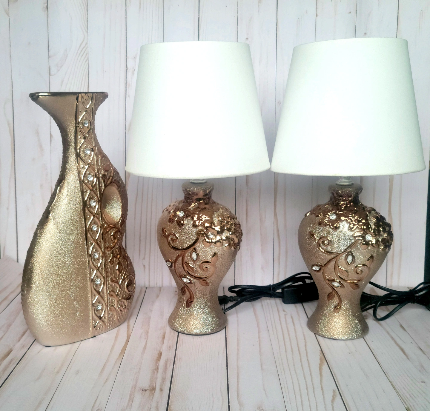 Elegant Night Lamps With Matching Vase. * Beatuful Hand Crafted Work. * Golden Copper Color Base with Decorated Clear Stones. * White Lamp Shades and BULB are ALSO INCLUDED. * Lamp with Shades Height 15" tall * Vase Height 12" tall * Comes from a pet-free, smoke-free home * Perfect for GIFT. * CASH ONLY This matching set will bring warmth and light to any space.