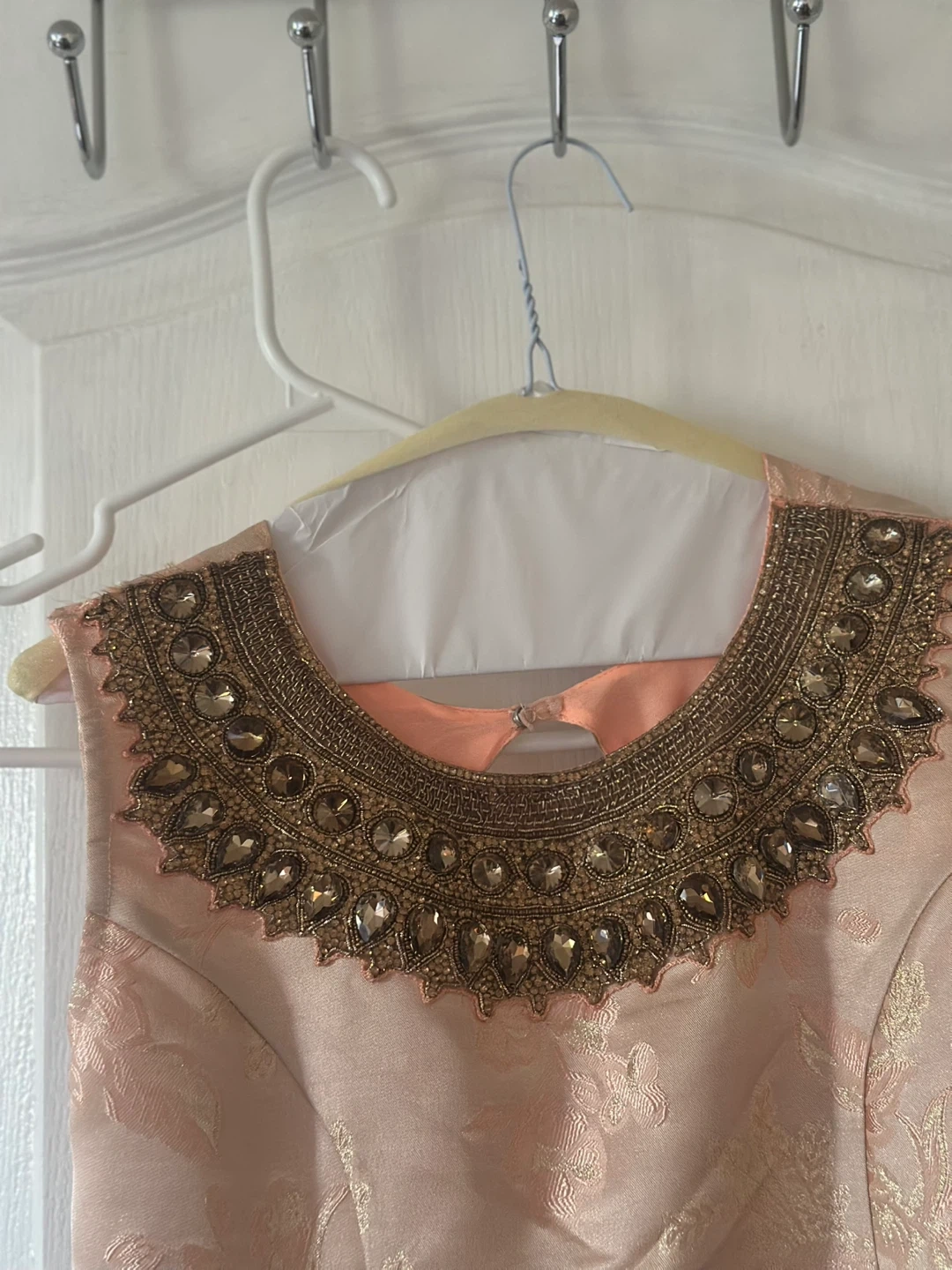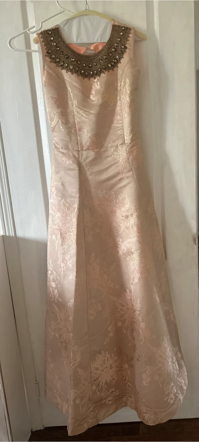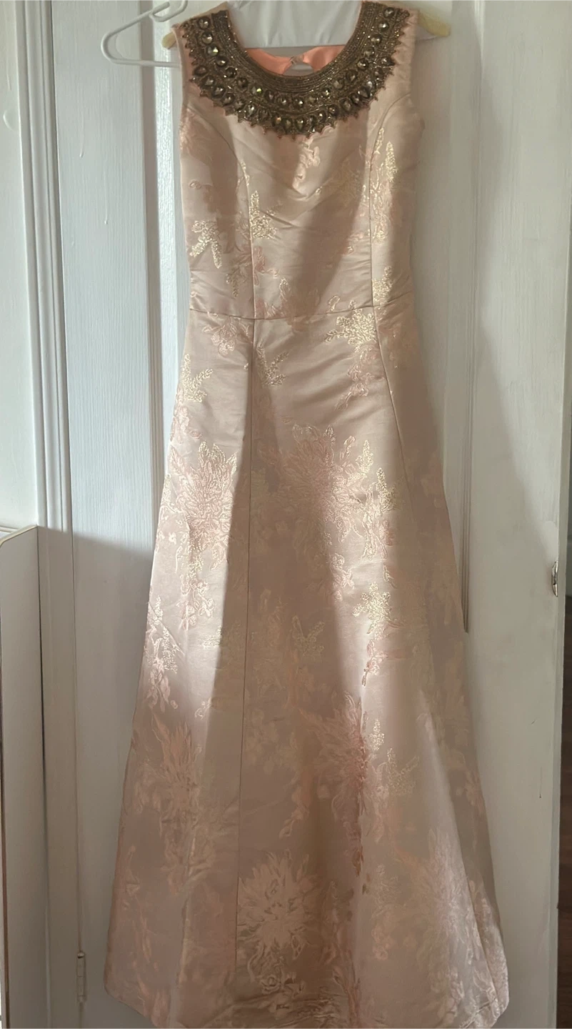 Selling a beautiful formal dress in a light pink and gold floral pattern. The dress features an ornate, beaded neckline. It's perfect for a special occasion!