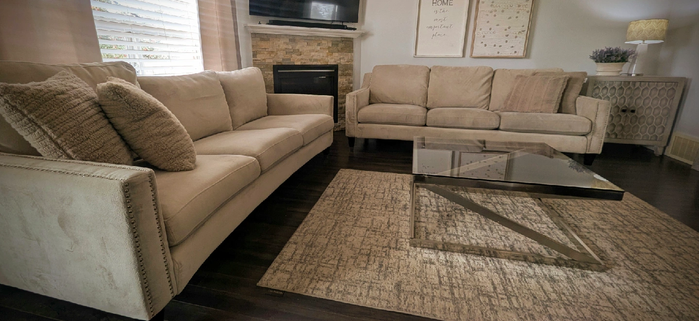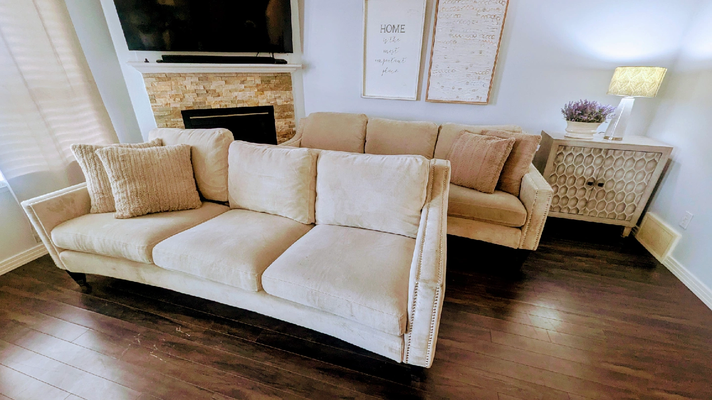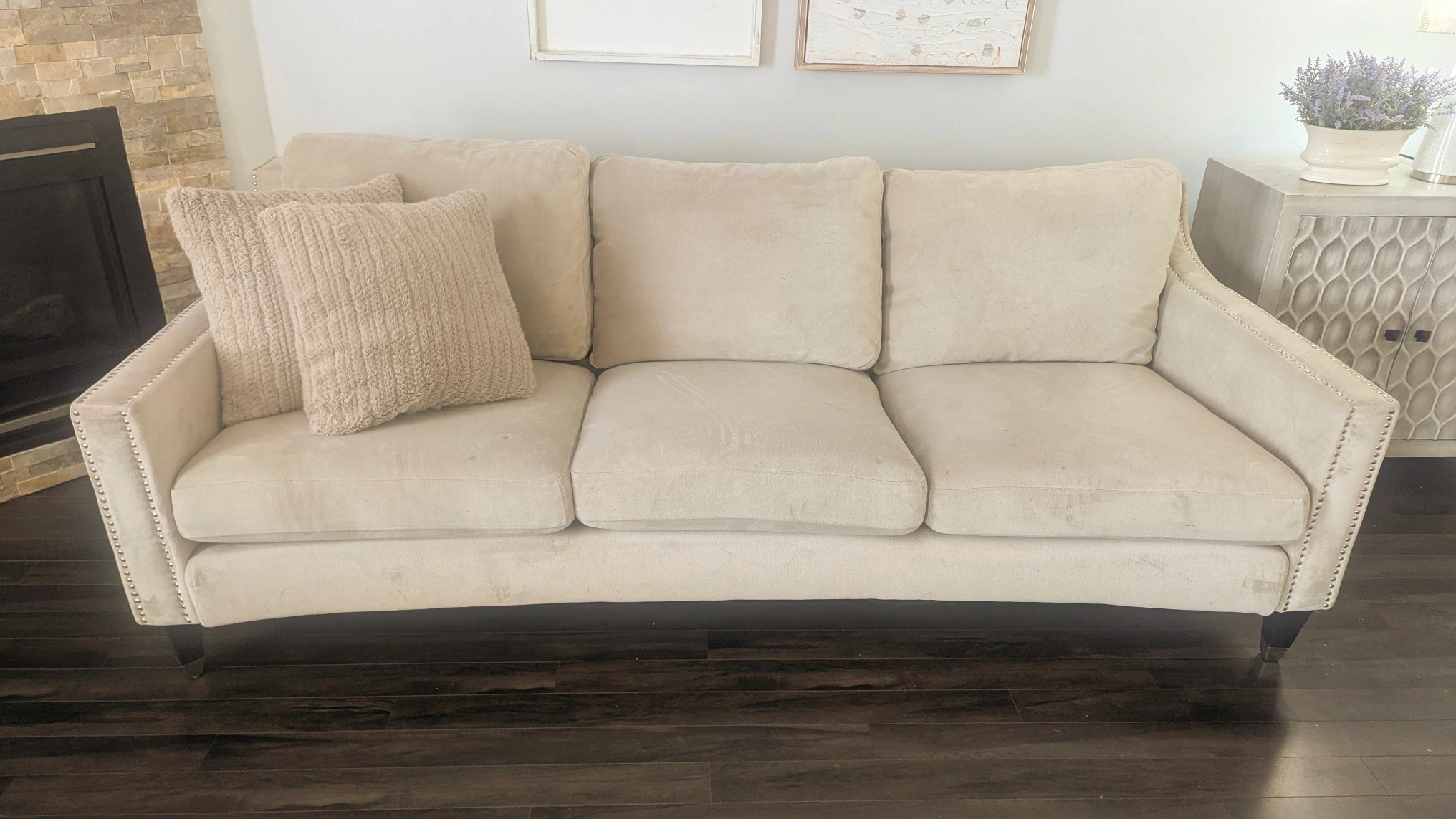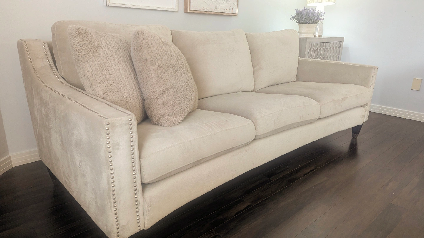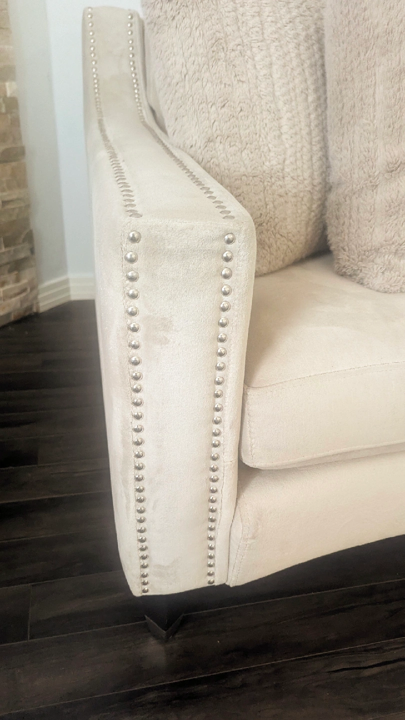 Selling these pair of comfy Velvet sofas! These sofas features a neutral beige colour that would look great in any living room. They were bought from Sofa Land last year, still in pristine condition and from a no pet home. The couches have studded detailing on the arms, adding a touch of elegance to the design. They're in great condition and ready for a new home!