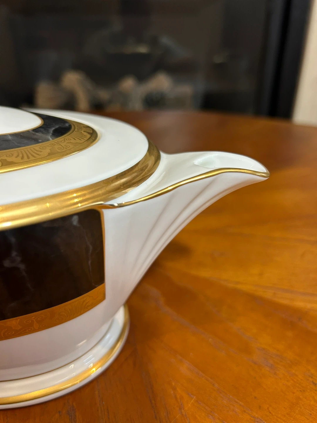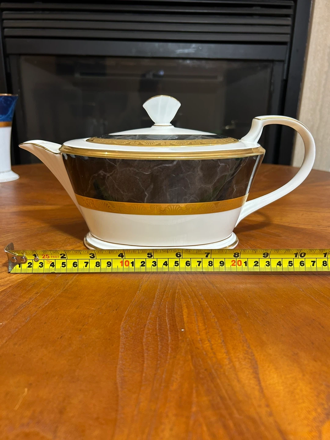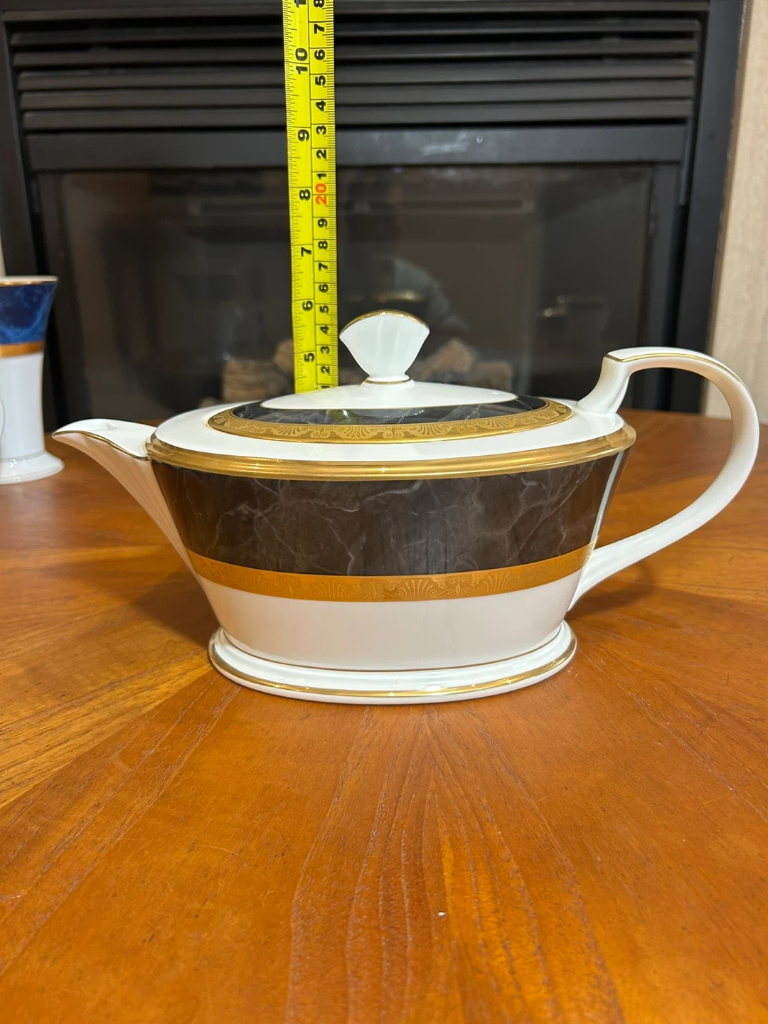This teapot is in great condition and features a beautiful design with gold trim. It measures approximately 8 inches in diameter and 6 inches in height. Perfect for tea lovers! Noritake Opulence Art Deco Bone China Coffeepot Set from Japan 1 Teapot 1 Creamer 1 Sugar Bowl 4 Mugs 1 Vase No chips or cracks. From a non smoking and pet free home. They are pre-loved items that they maybe have signs of wear so please study all photos for more details. Condition: Overall in very nice Used vintage condition for its ages. Thank you so much!