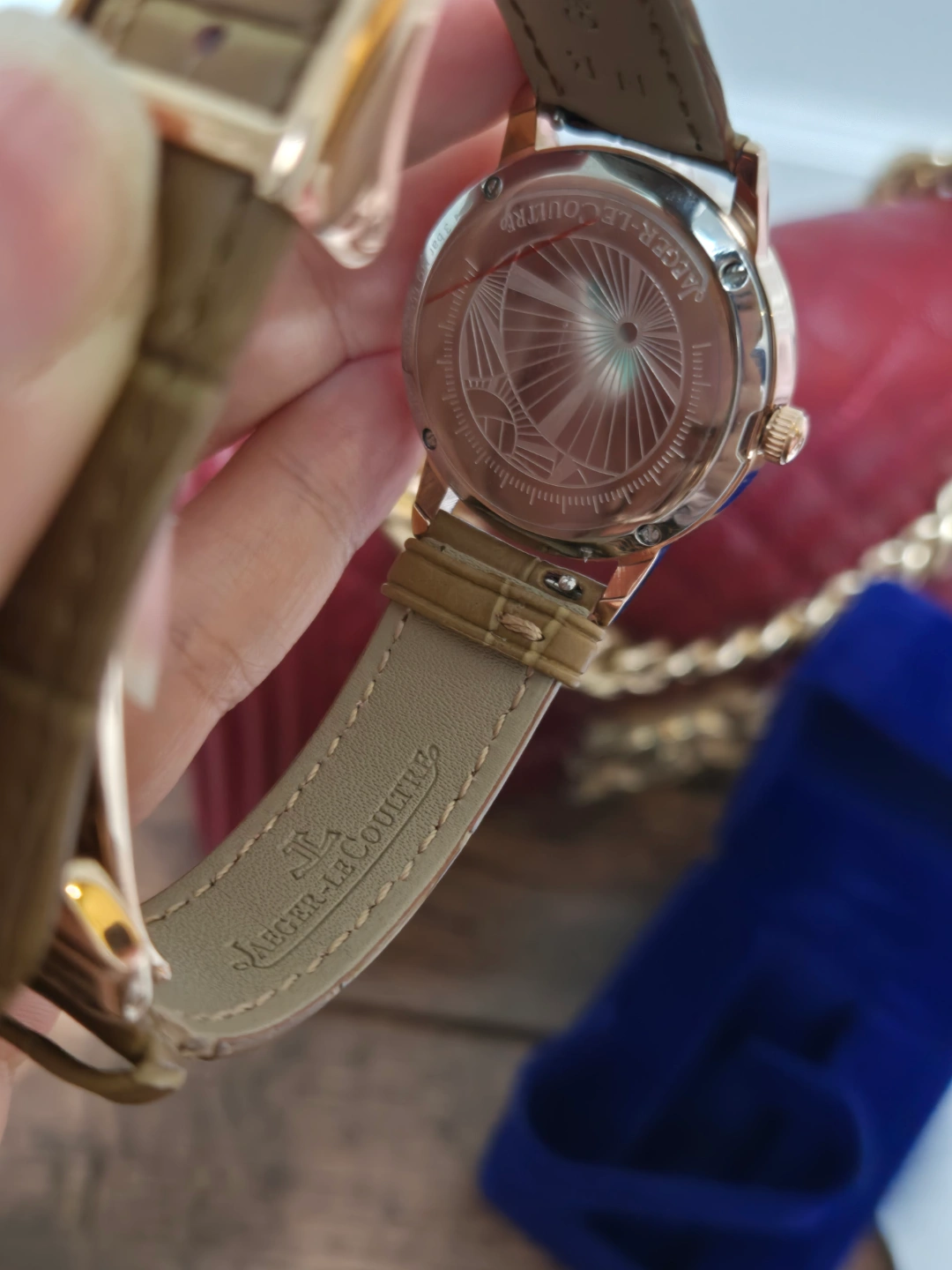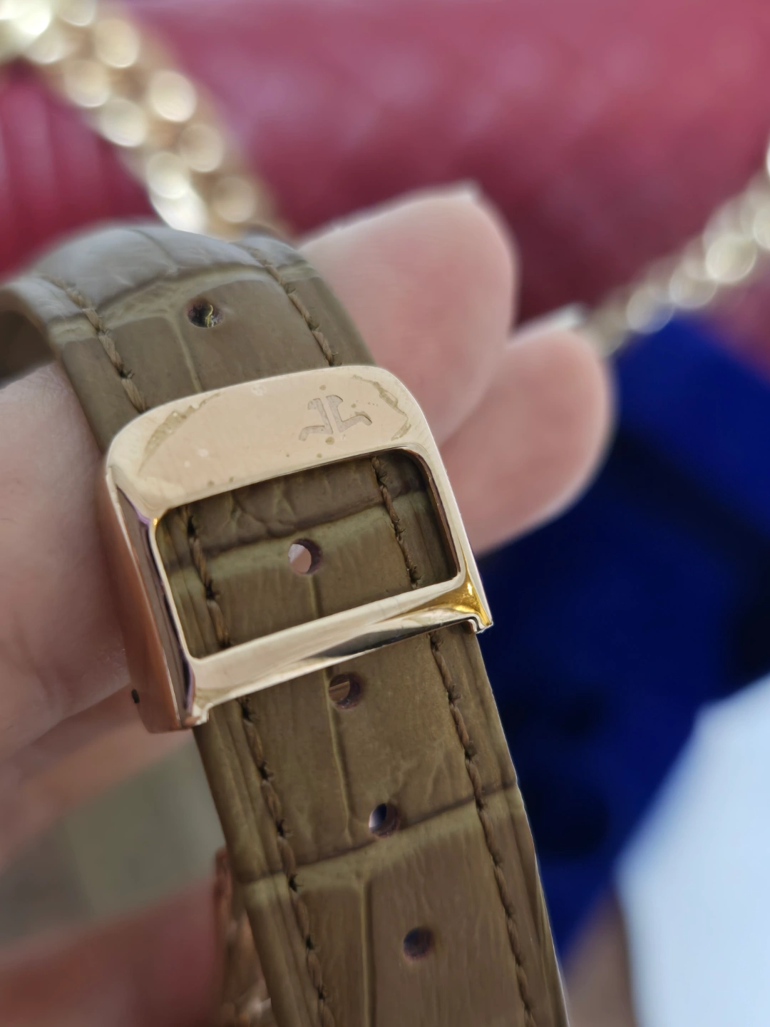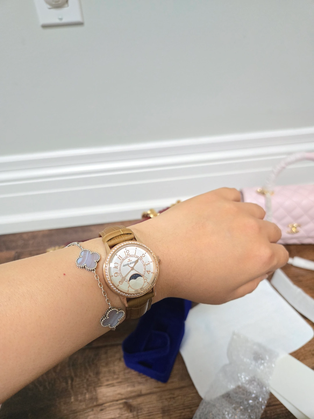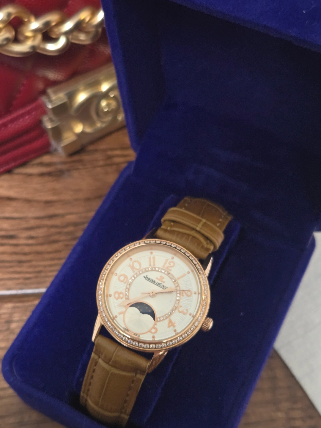 34Wristwatch with a brown leather strap. The watch face is a light colour. There are crystals around the edge of the watch face. Consider the peaceful flow of time with this beautiful timepiece.