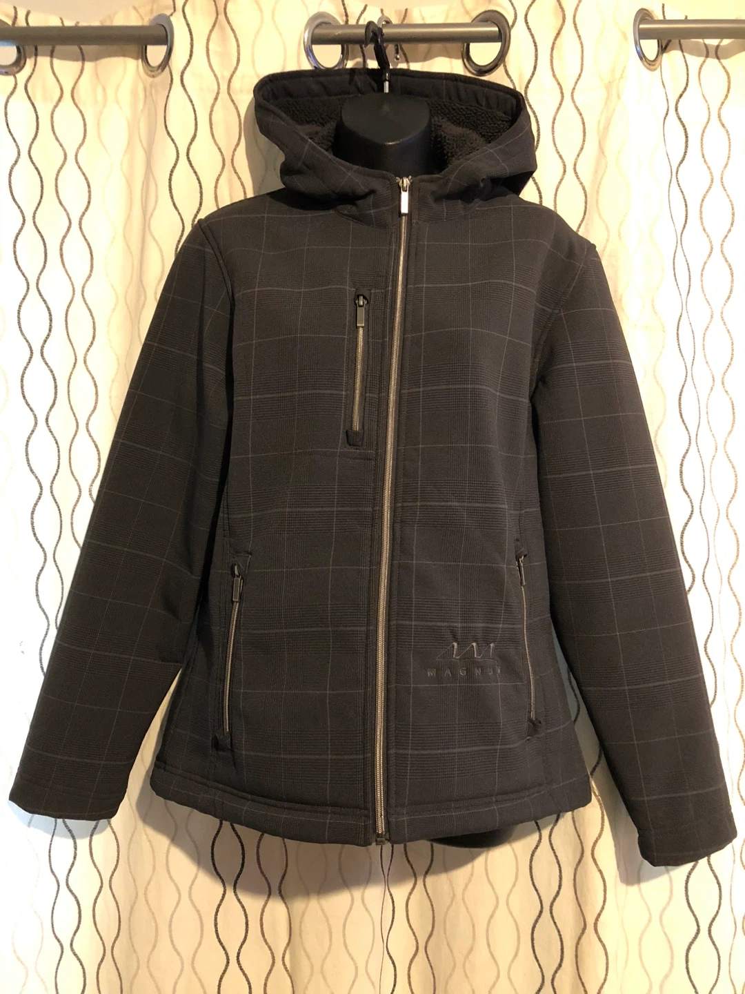 20Selling an Elevate Sport women's jacket in size M. It features a stylish plaid pattern and a cozy sherpa-lined hood. Perfect for staying warm and looking great!