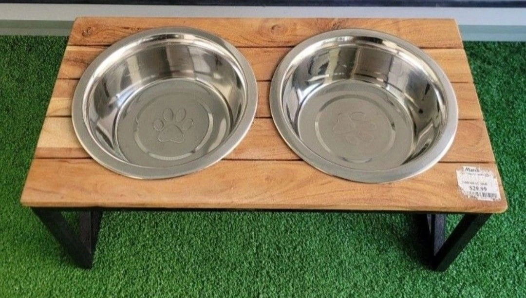 Elevated dog bowl stand with two stainless steel bowls. The frame is made of wood with a black metal base. Originally bought for $29.99