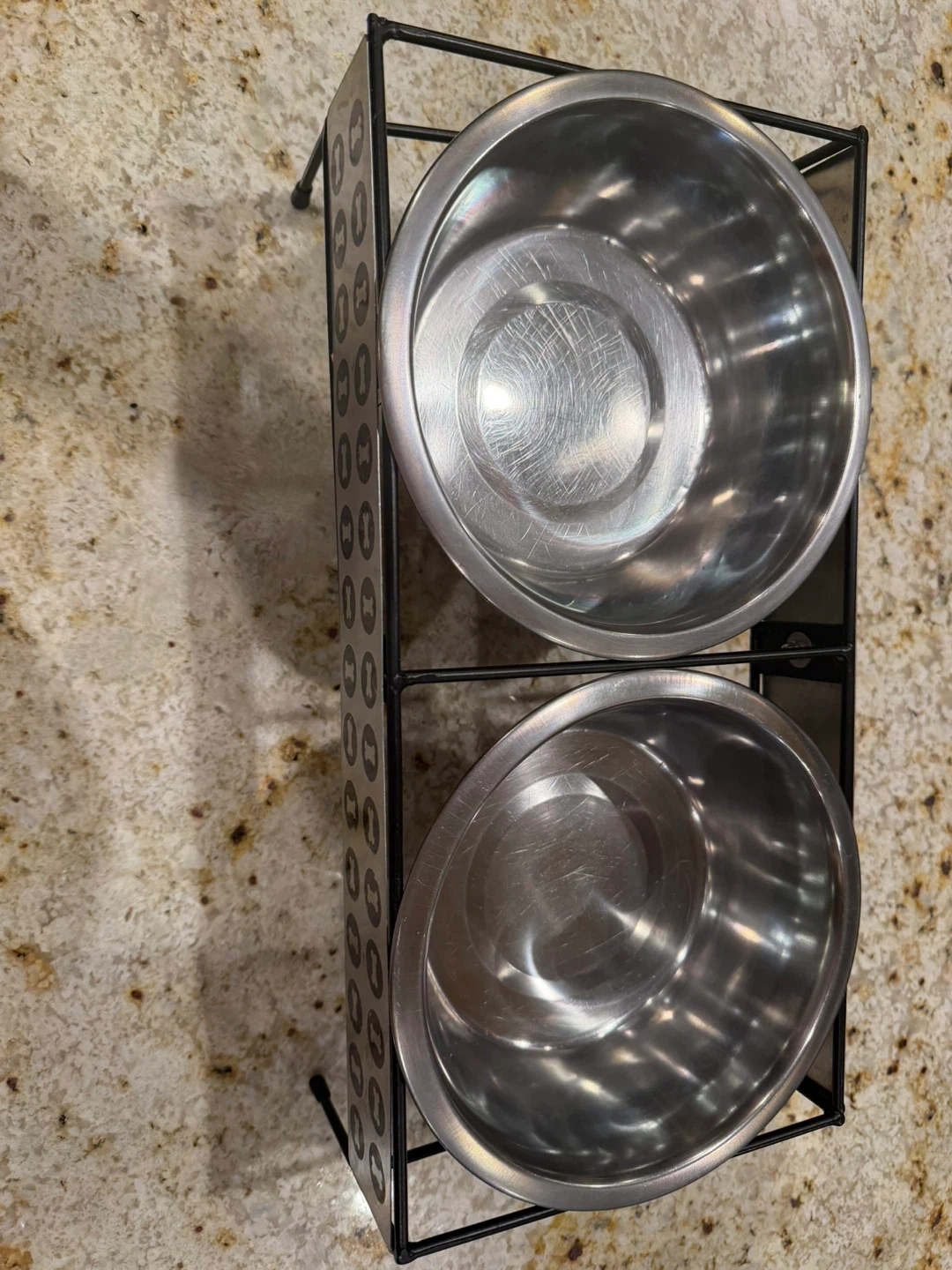 5These are elevated dog bowls with a stand! The bowls are stainless steel and the stand is black metal. It's in great condition and ready for your furry friend