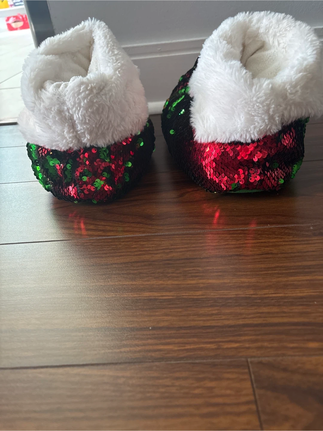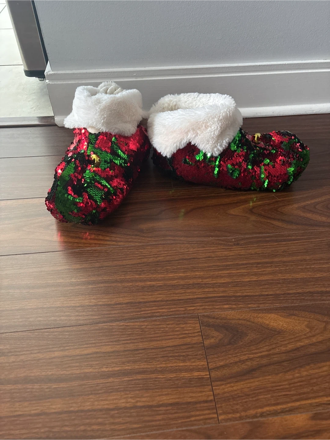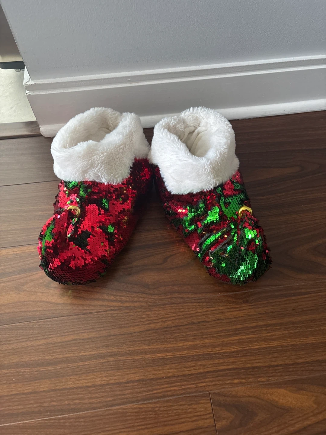 152Cute and festive sequin slippers! Perfect for the holidays and keeping your feet cozy. They feature a red and green sequin design with a soft, white faux fur lining.