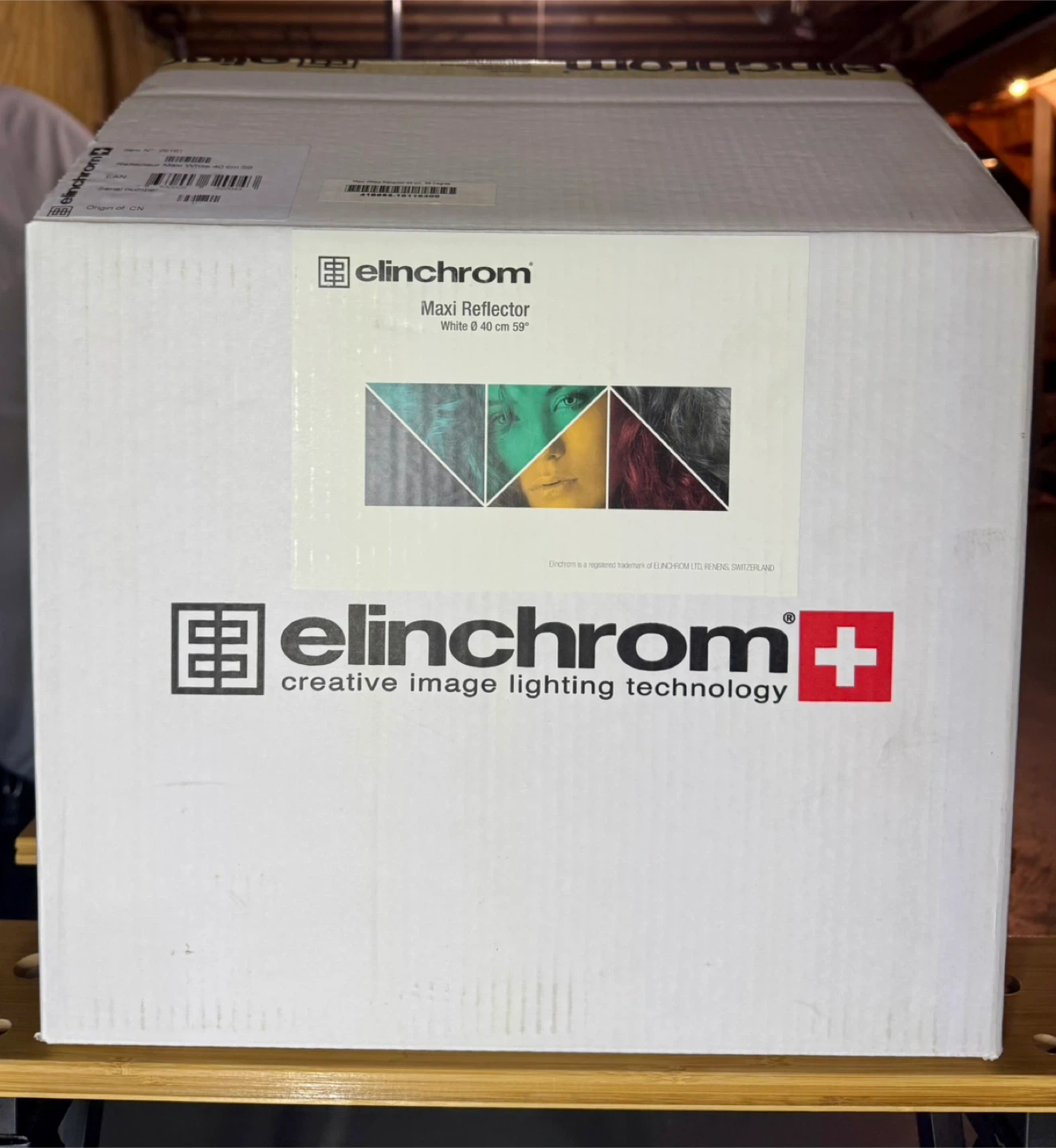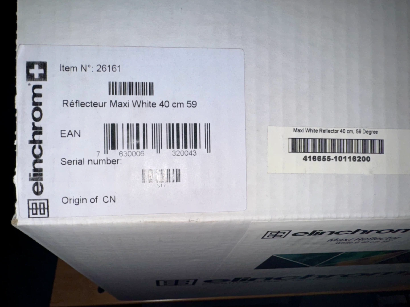 ELINCHROM MAXI WHITE REFLECTOR 40 CM 59 DEGREE BEAM SPREAD Mint. Rare. Unused. Therefore like new condition. Compatible with all Elinchrom heads except the Quadra. An adapter is needed for the Quadra. $150 cash. Pickup in Markham.