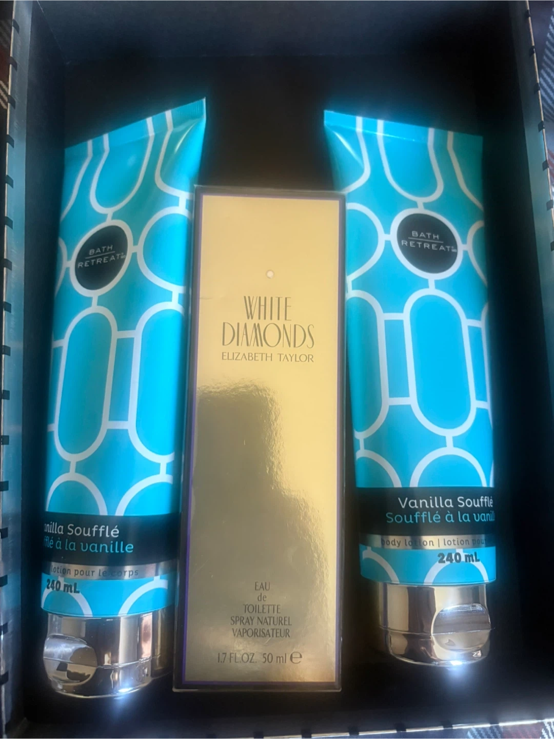 Selling an Elizabeth Taylor White Diamonds gift set! It includes a 50ml eau de toilette spray and two 240ml Vanilla Soufflé body lotions from Bath Retreat. A perfect gift for someone special or a treat for yourself