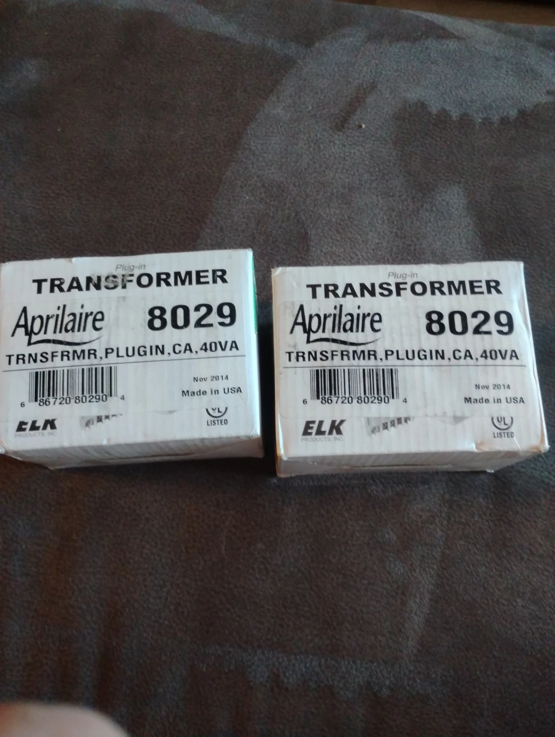 58Brand new. Selling two ELK TRG2440 plug-in transformers. They are 24VAC, 40VA and feature auto-reset overload protection. Aprilaire 8029 transformers, also plug-in, CA, 40VA.