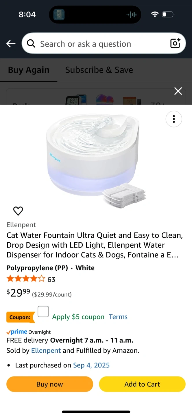 10Selling an Ellenpent Smart Pet Water Fountain with a 2.5L large capacity. It's ultra quiet and easy to clean, with a drop design and LED light. Originally bought for $29.99. Brand new in box!