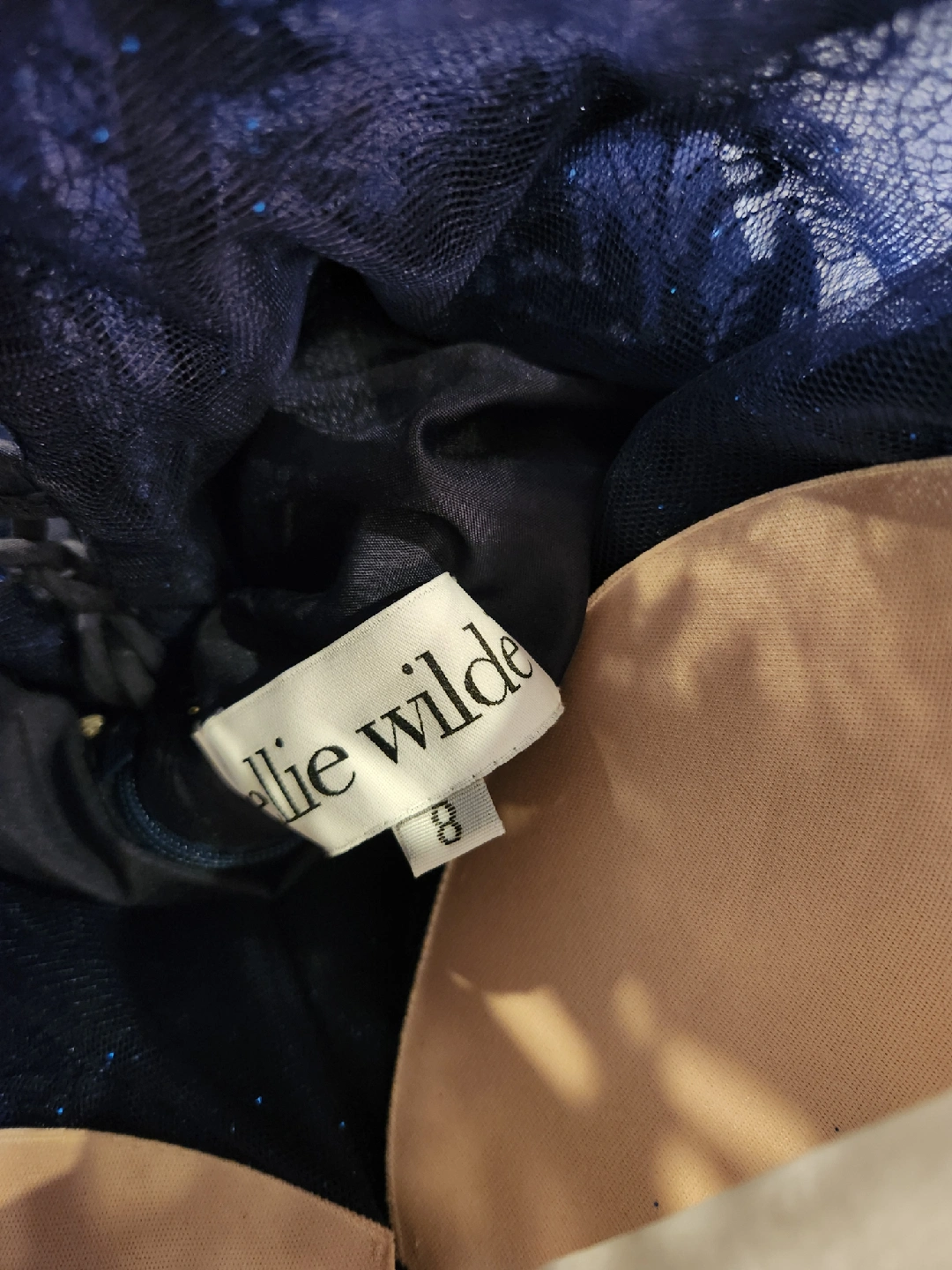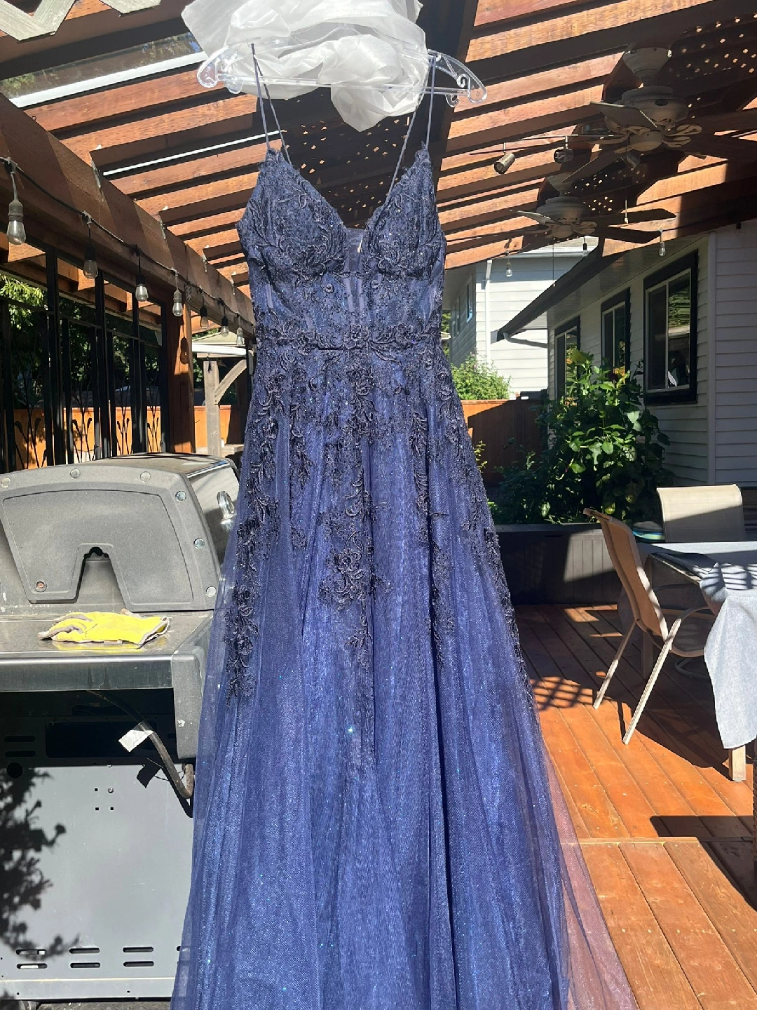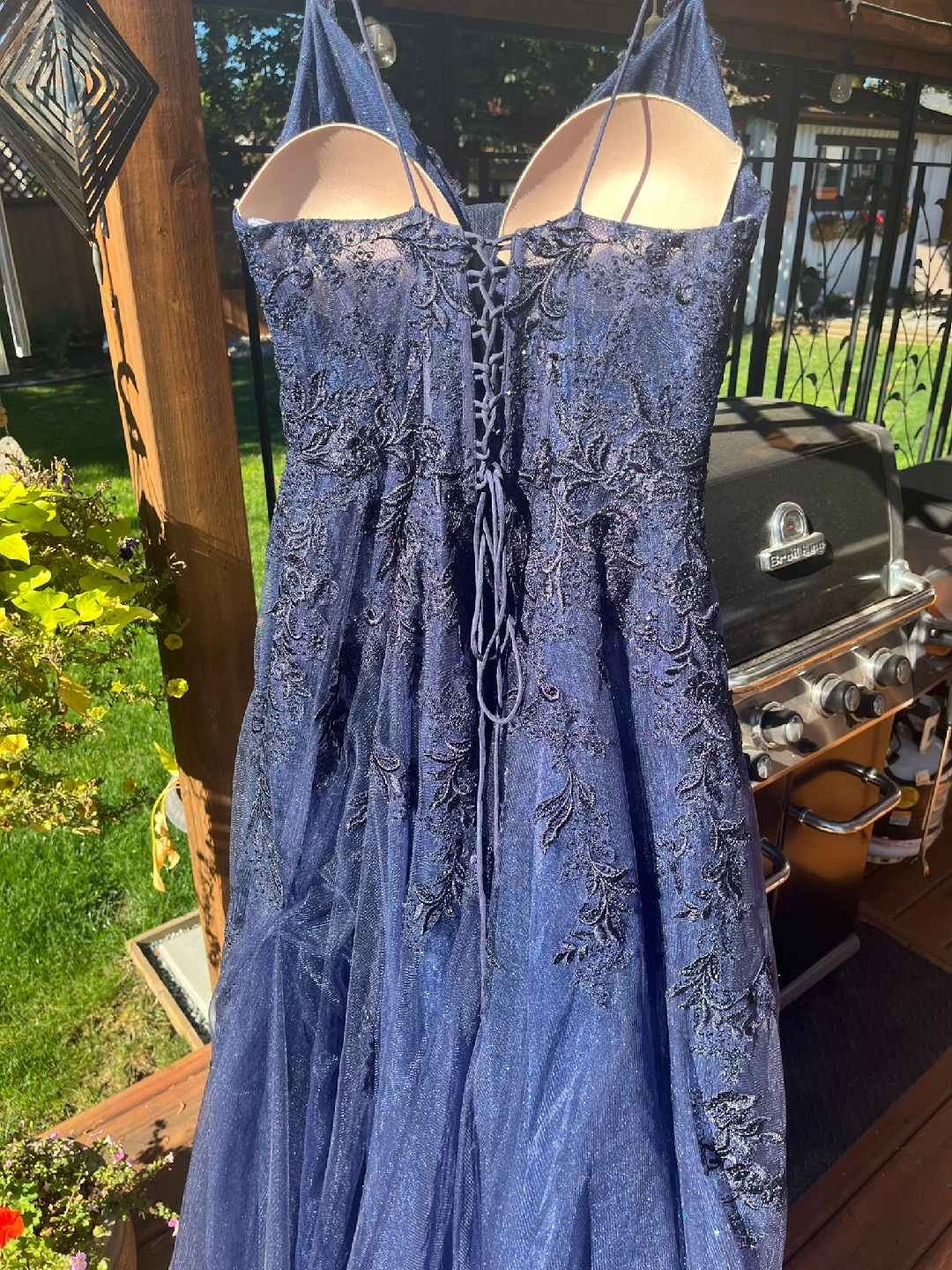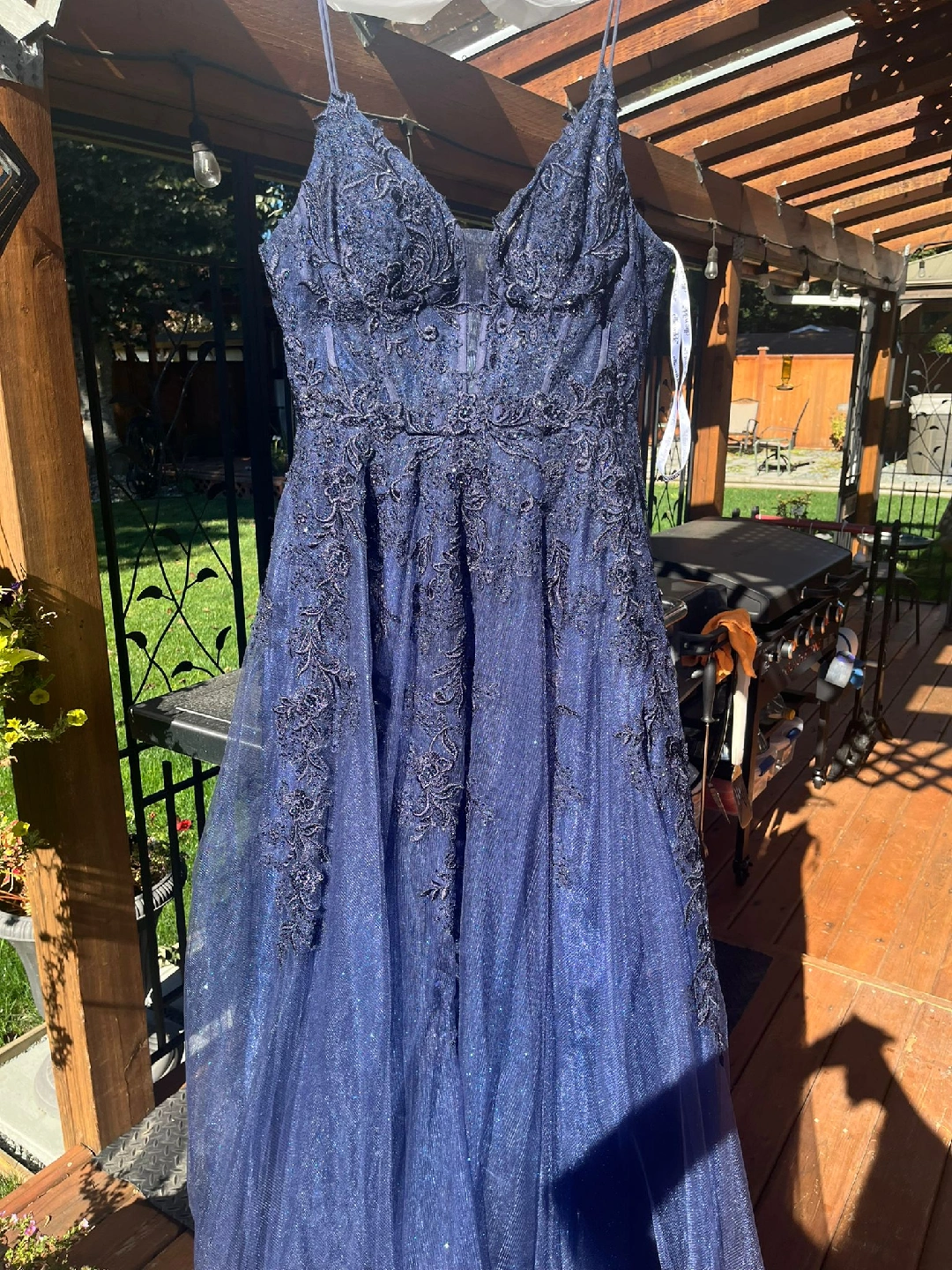 60Selling a beautiful navy blue formal dress from Ellie Wilde! It's a size 8 and features intricate lace detailing and a flattering silhouette with a corset back. Full length with pockets. Perfect for prom or any special occasion! Bought for $800, it's been worn once.