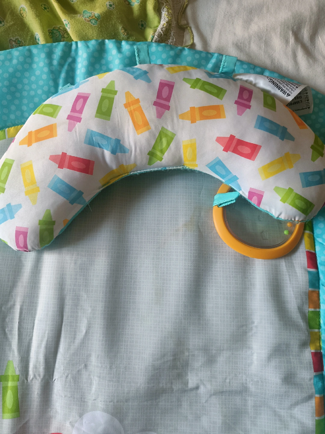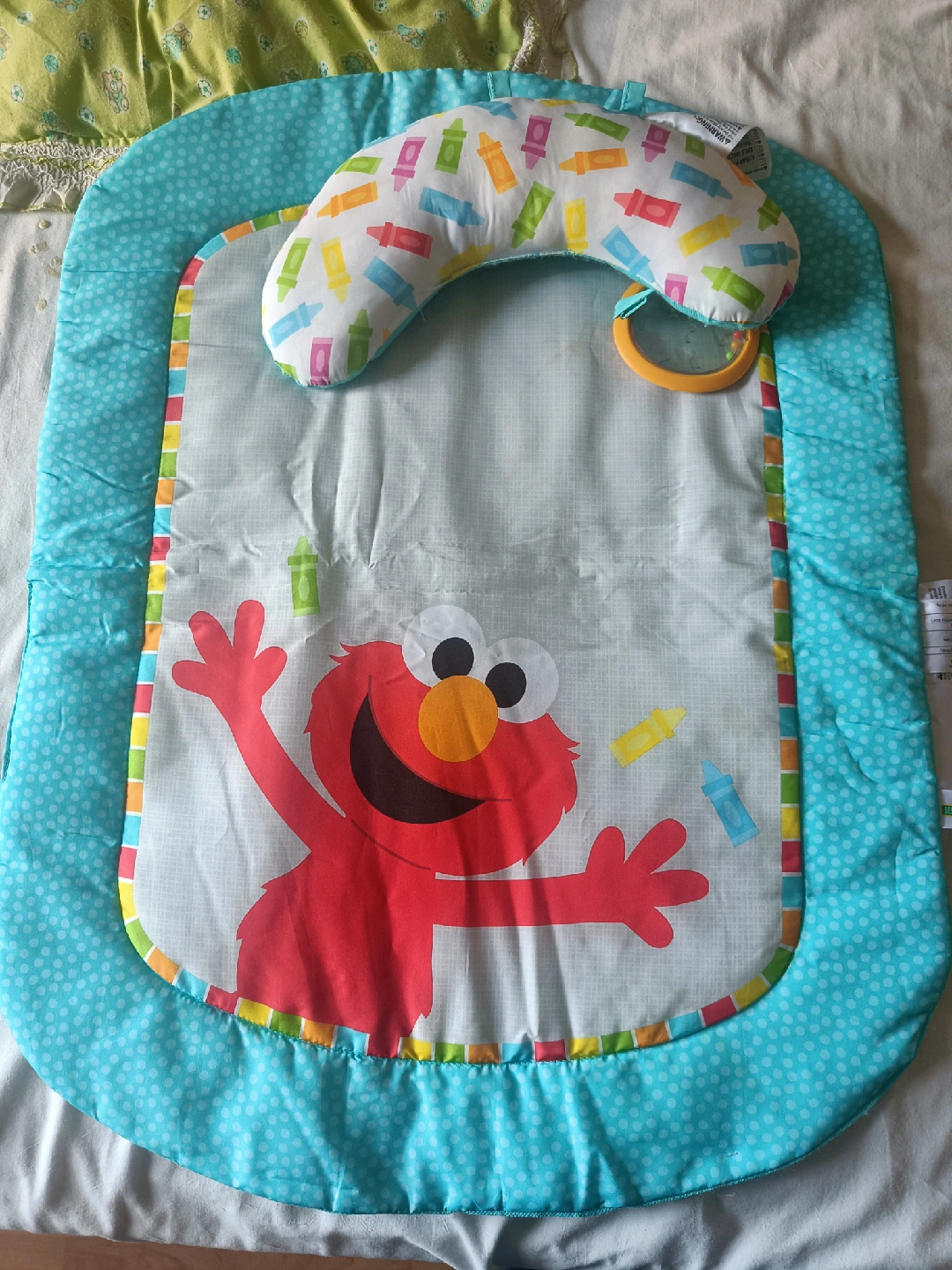 A fun Elmo-themed play gym mat for your little one! Features bright colours and engaging designs to keep baby entertained. Includes a detachable pillow with colourful crayon pattern and a mirror toy. Perfect for tummy time and early development!