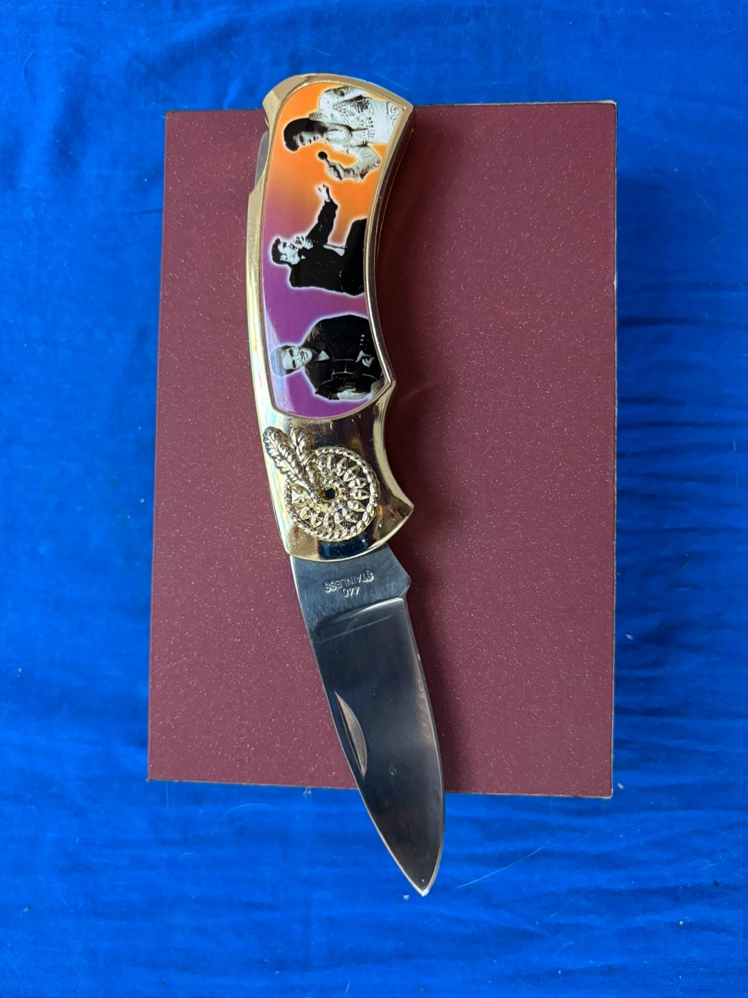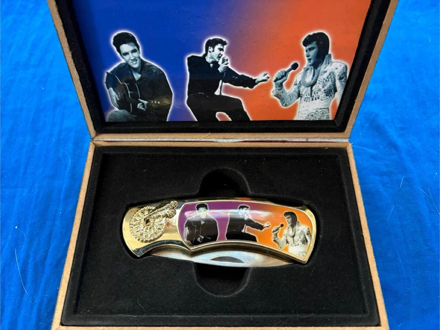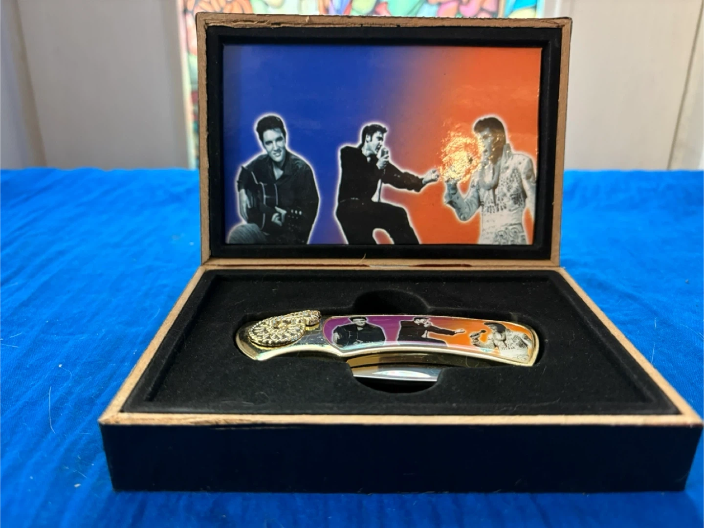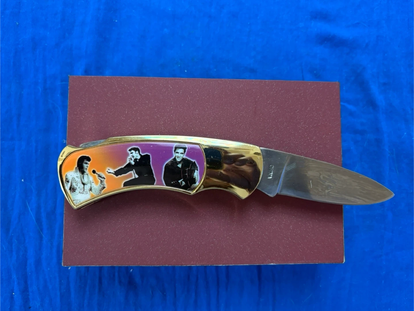 58Selling a collectible pocket knife featuring Elvis Presley. It comes in its original box and is in great condition. The knife has images of Elvis on the handle and a stainless steel 3” blade. Bought originally on eBay for $70.