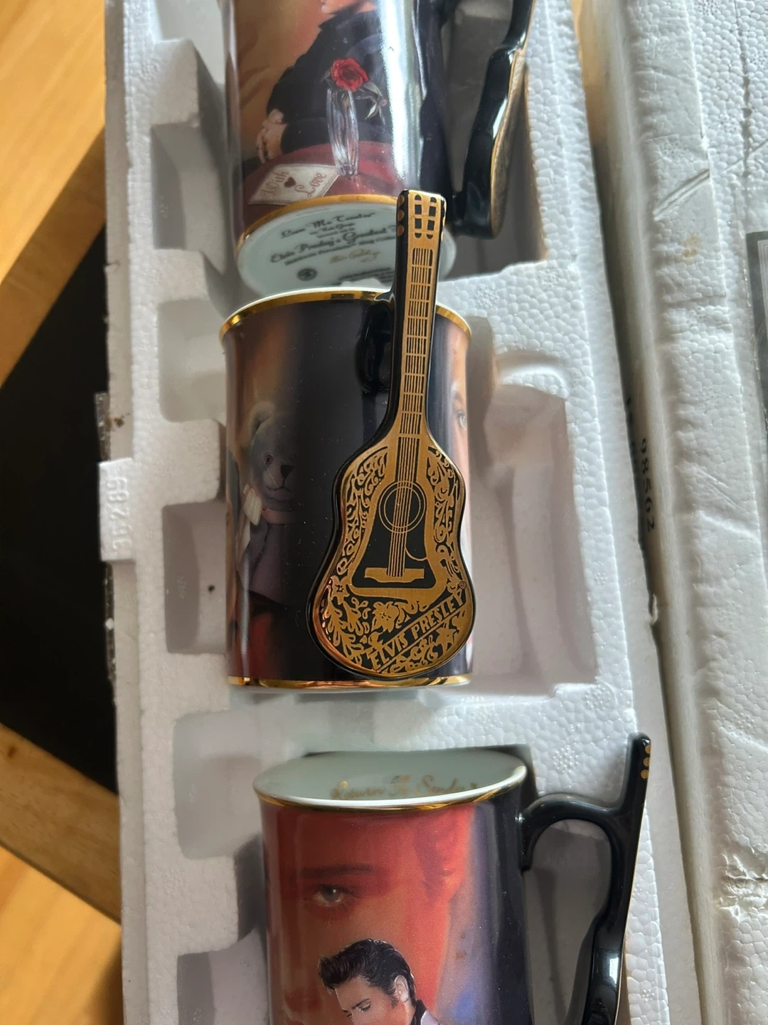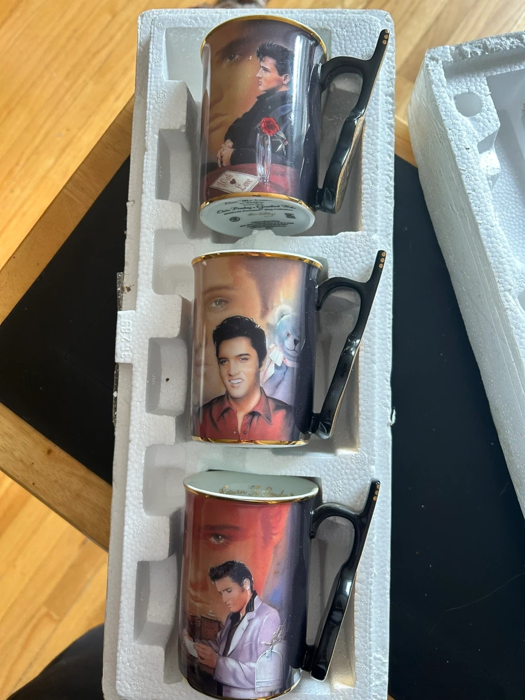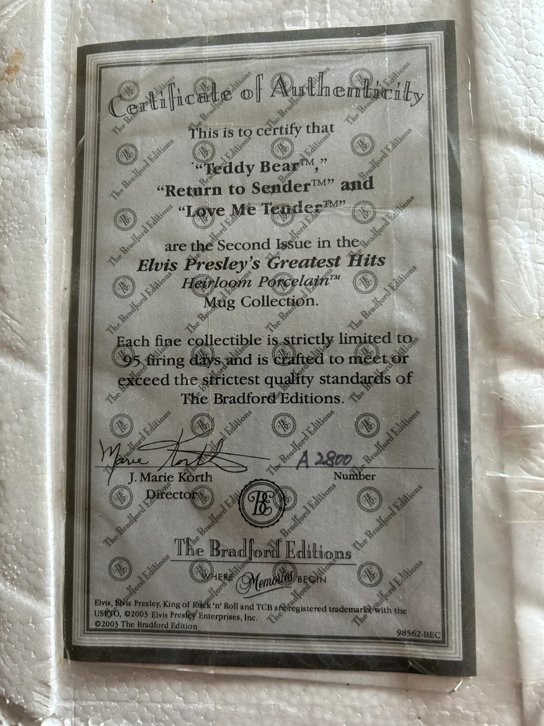 Selling an Elvis Presley's Greatest Hits Heirloom Porcelain Mug Collection from The Bradford Editions! This is the second issue in the collection and includes the mugs "Teddy Bear", "Return to Sender" and "Love Me Tender". Each collectible is strictly limited to 95 firing days and is crafted to meet or exceed the strictest quality standards of The Bradford Editions comes with certificate of authenticity