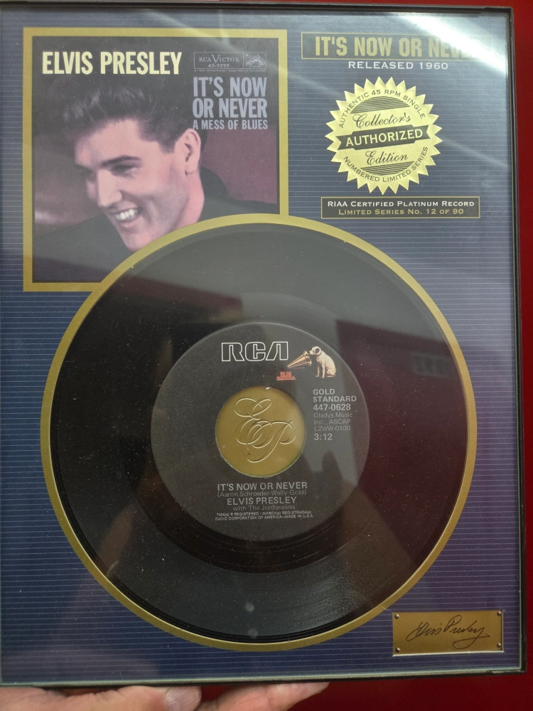 Selling a framed Elvis Presley record, "It's Now or Never". It's an authentic 45 RPM single from a numbered limited series, RIAA certified platinum record, and released in 1960. A great collector's item!