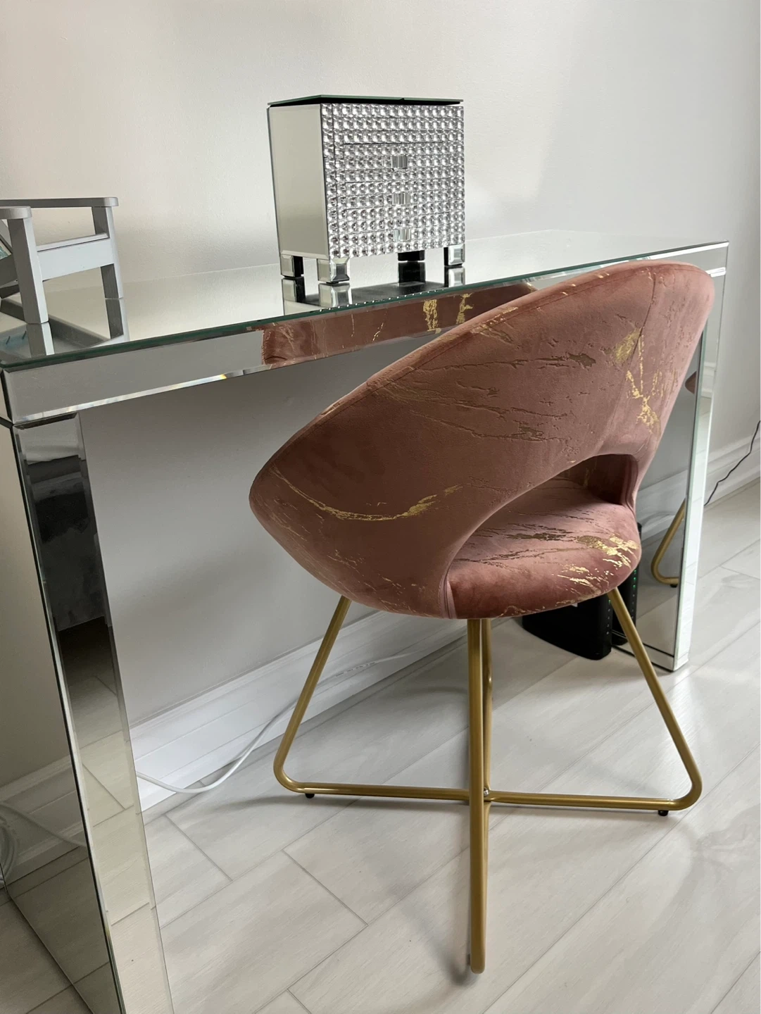 NEW chic accent chair upholstered in soft pink velvet with a striking gold marbling pattern. It features a comfortable, rounded back and a sturdy gold metal base. So cute for a girls room, vanity or office! Smoke/pet free.