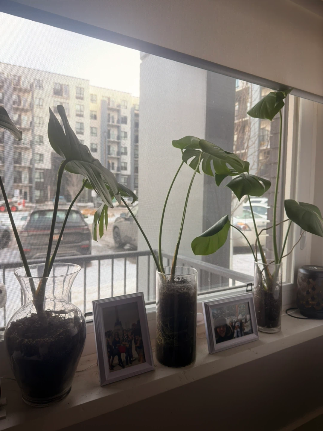 Healthy Monstera Deliciosa cuttings ready to be planted! These plants are known for their unique split leaves. They're perfect for adding some lush greenery to your home.