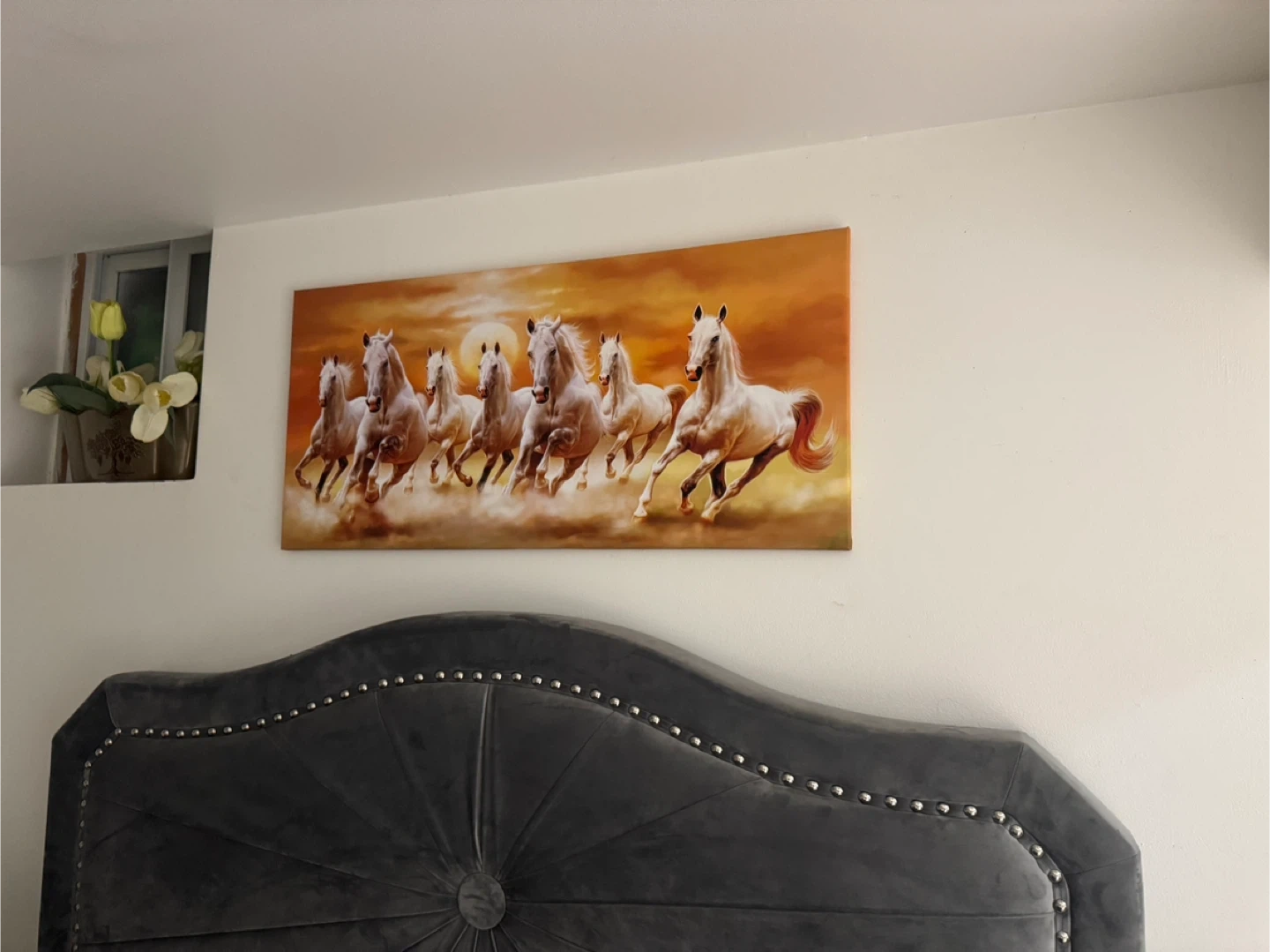 Beautiful canvas wall art featuring a herd of seven white horses galloping. This piece captures the dynamic movement and spirit of these majestic animals against a warm sunset backdrop. It's ready to hang and add a touch of elegance to any room. A great statement piece for living rooms or offices!