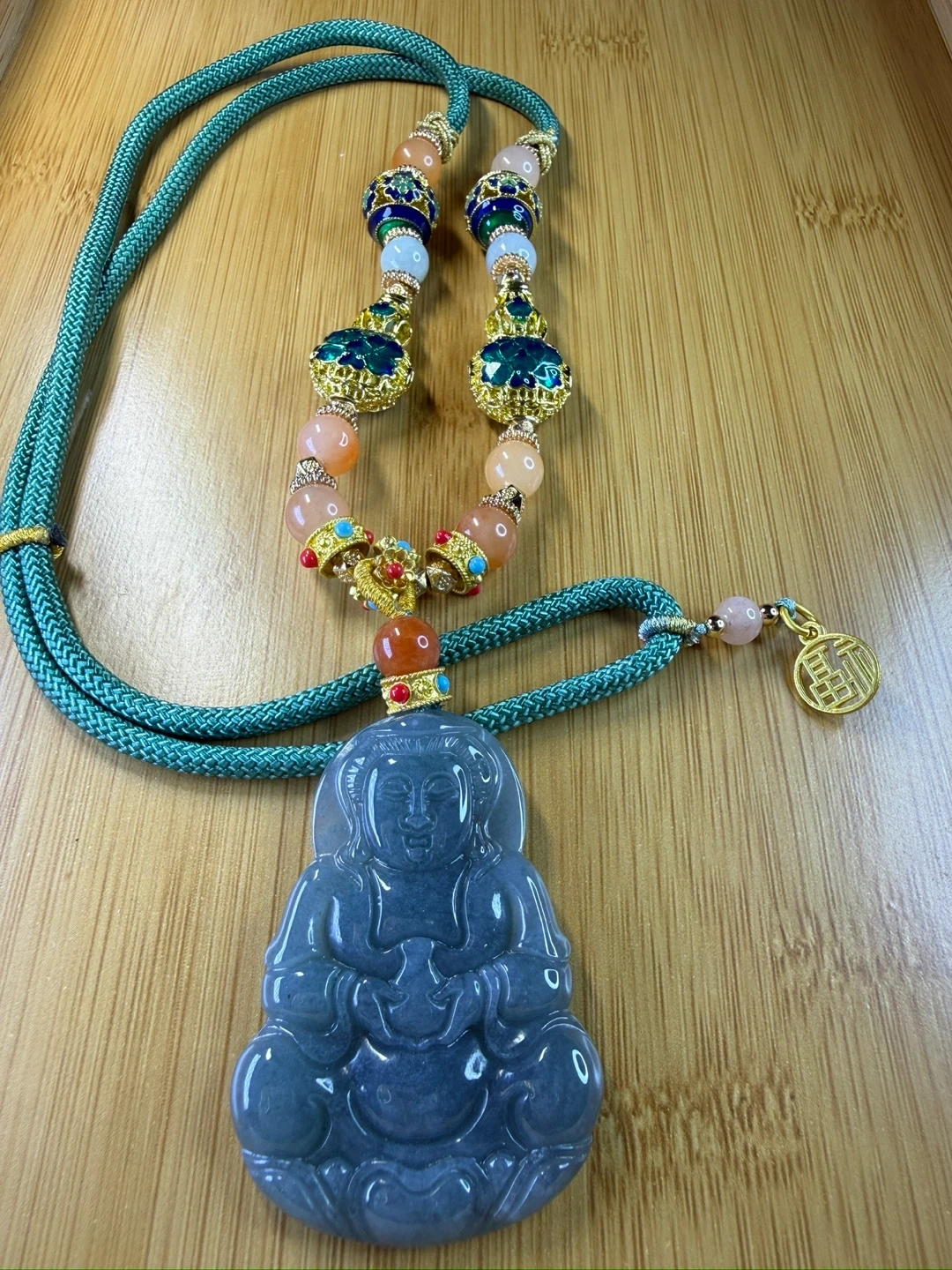 This pendant features a hand-carved figure of Guanyin, the Bodhisattva of Compassion, crafted from jade.
