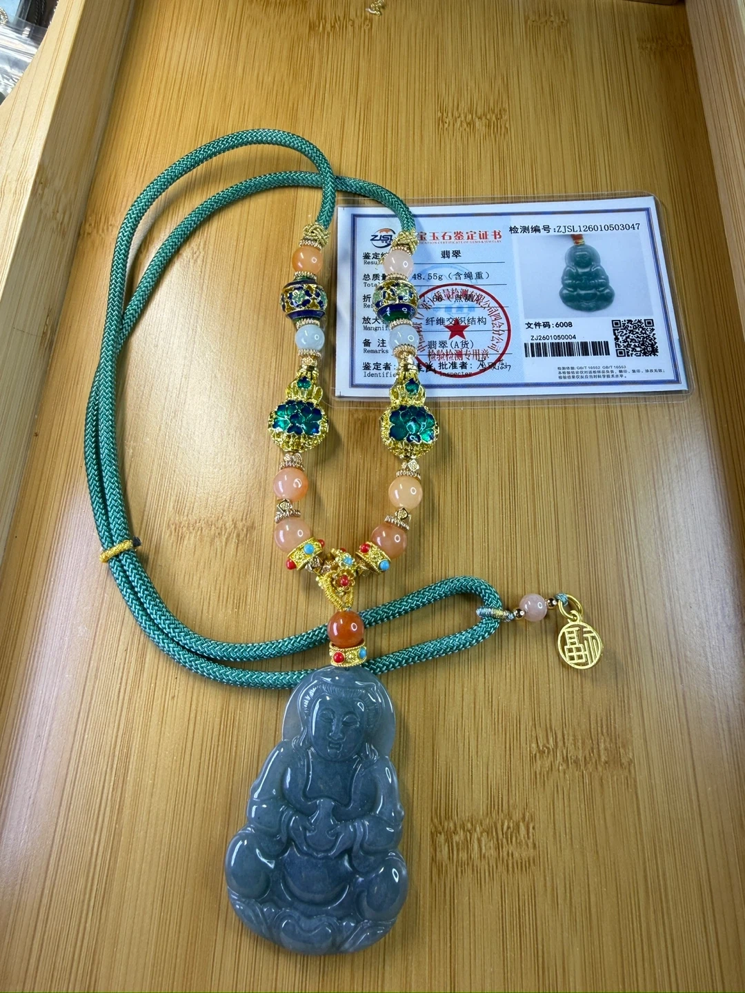 This is a carved high quality jade Guan Yin pendant with a blue hue. It measures 48.9mm x 35mm. The pendant hangs on a green cord with decorative beads.