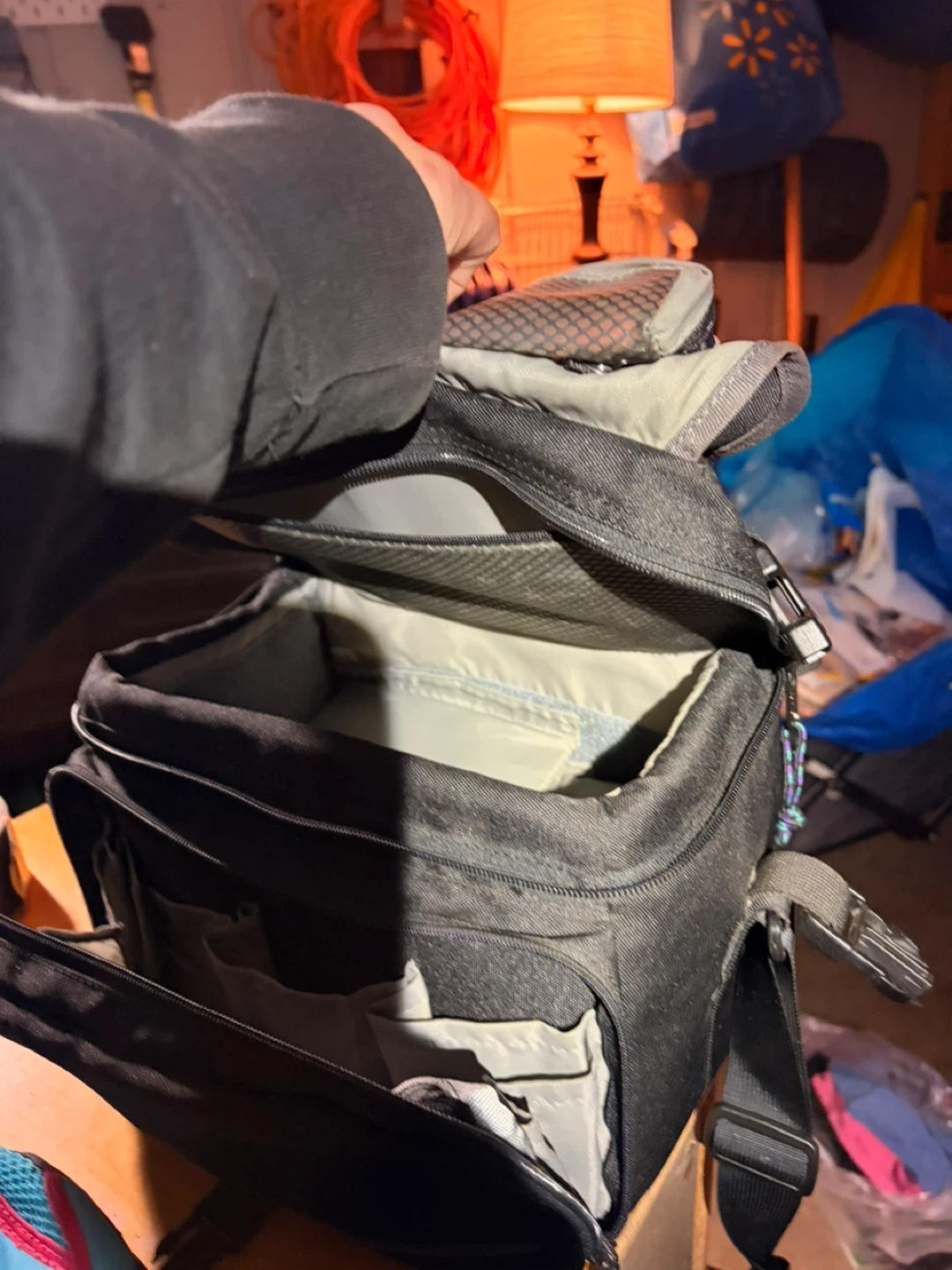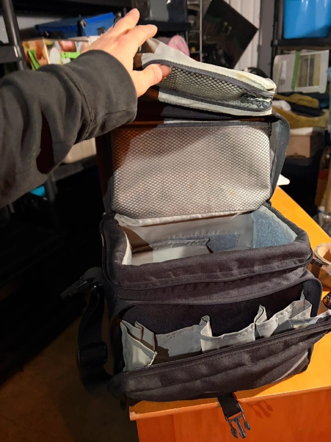 This is an older black camera bag in good condition. It has an adjustable shoulder strap and numerous zippered pockets and adjustable compartments for storing camera equipment and accessories. Fits standard DSLR camera body and probably 3 or 4 lenses, depending on size. Perfect for photographers on the go!