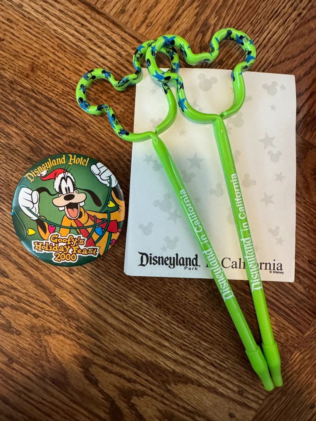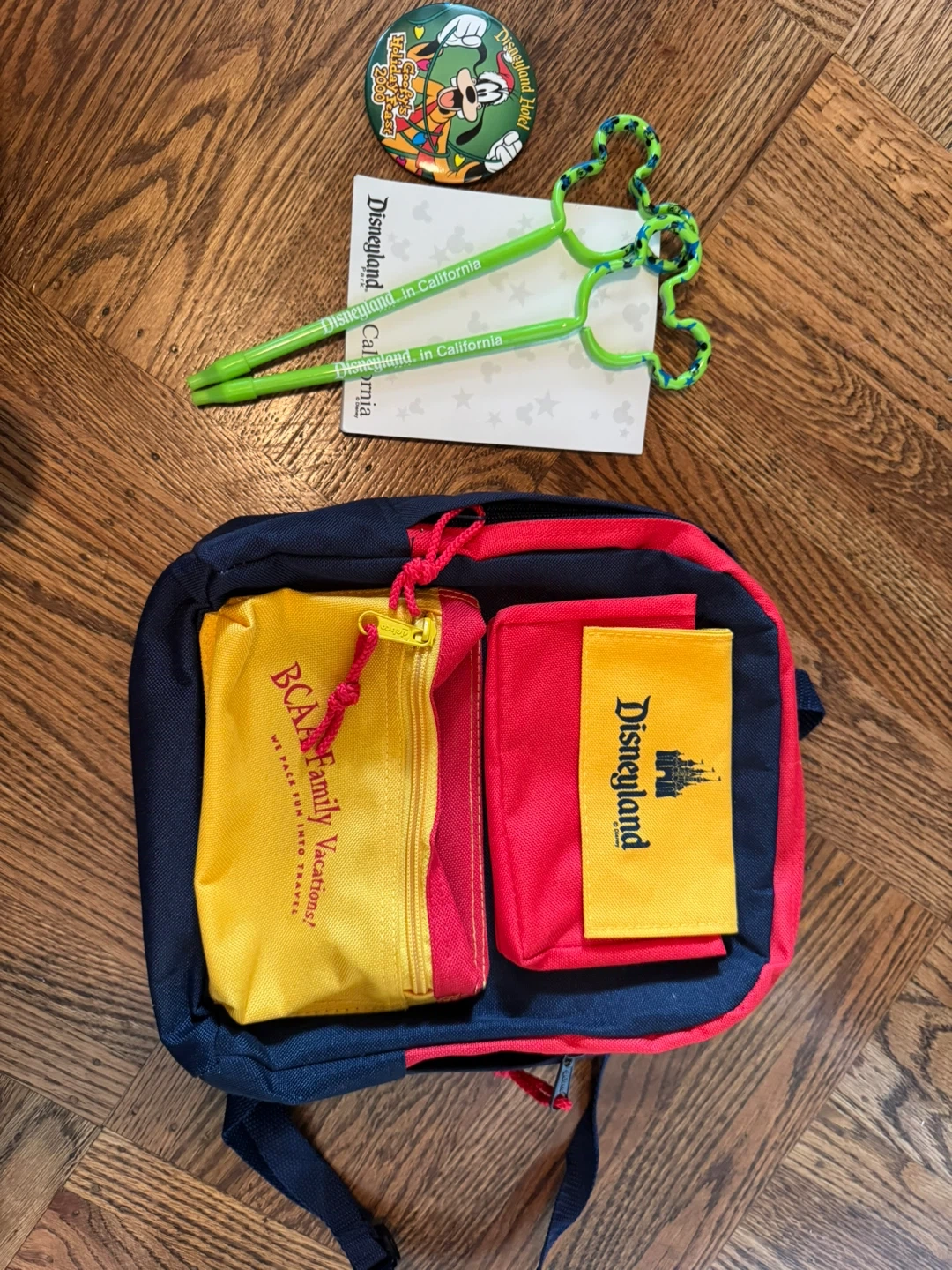 This is a Disneyland California backpack featuring multiple compartments. It includes two Mickey Mouse themed pens and a Goofy's Holiday Feast 2000 pin. Perfect for carrying essentials on a trip!