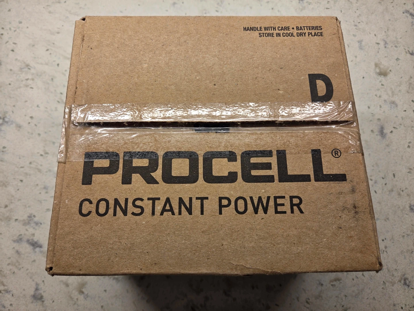 PROCELL Constant Power D batteries. This bulk display contains 6 cartons, with 12 batteries each, for a total of 72 batteries. March 2032 date. These are 1.5V batteries.
