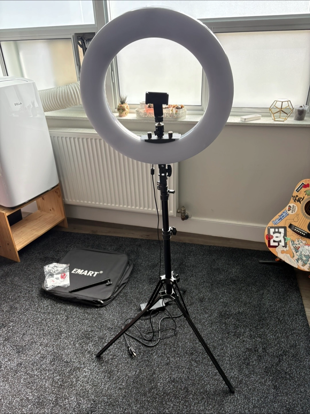 *I do not ship. Must come to me for pickup. Cash only.* Selling an Emart ring light, perfect for content creation or video calls! It comes with a tripod, carrying case, and accessories. Great condition and ready to use! The ring light is able to stand up to approximately 75 inches (191 cm) tall. And can be compacted into a 19 inch (48 cm) carrying case.