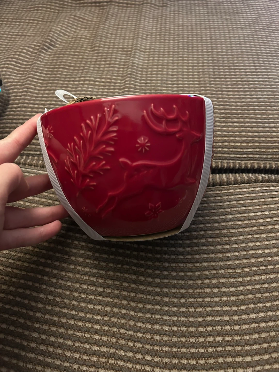 243Selling a festive bowl set of 3 featuring red, grey and white embossed designs with reindeer and foliage. Perfect for adding a touch of holiday cheer to your table! BRAND NEW!