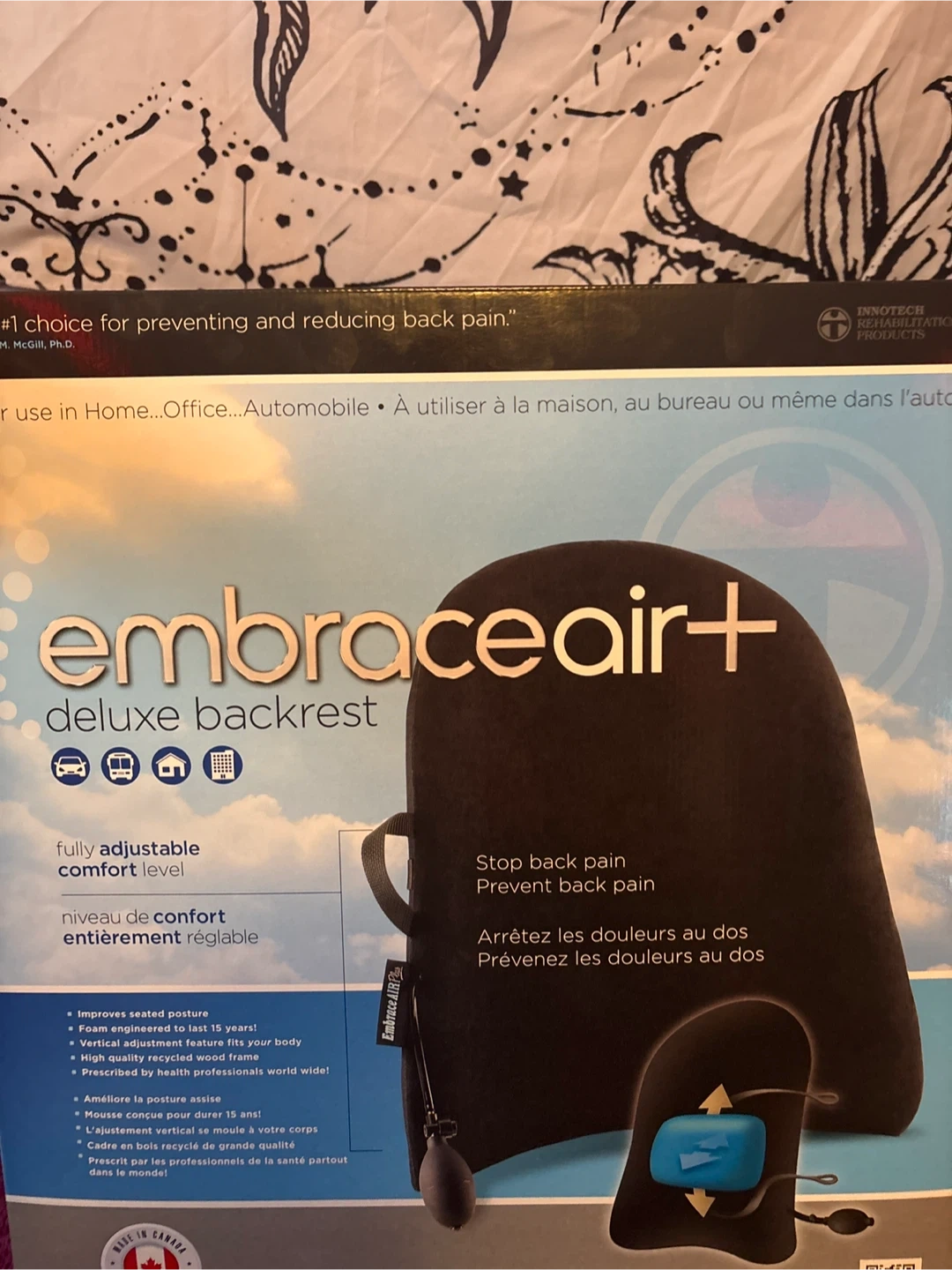 15Selling an EmbraceAir+ deluxe backrest. It's fully adjustable for comfort and helps improve seated posture. The foam is engineered to last for 15 years! It also features a vertical adjustment to fit your body. Made with high-quality recycled wood frame and prescribed by health professionals worldwide