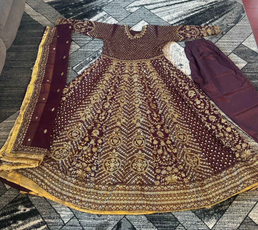 Beautiful burgundy brand name Pakistani suit with intricate gold embroidery. Includes the long dress, pants, and dupatta (scarf). Perfect for special occasions! Worn only once for few hours.