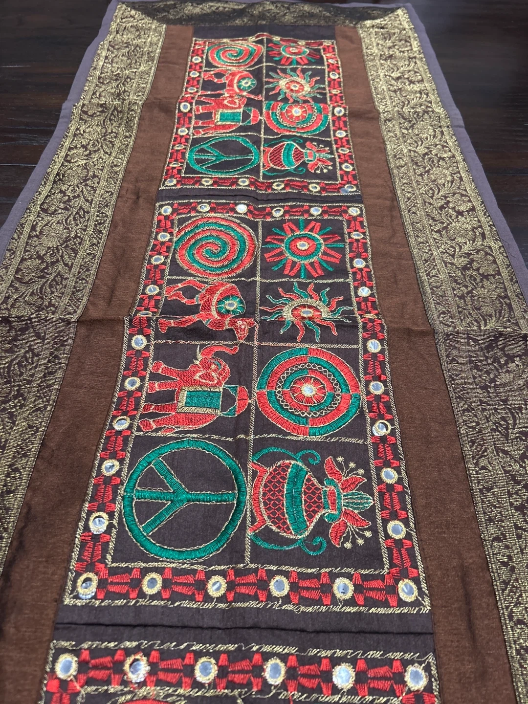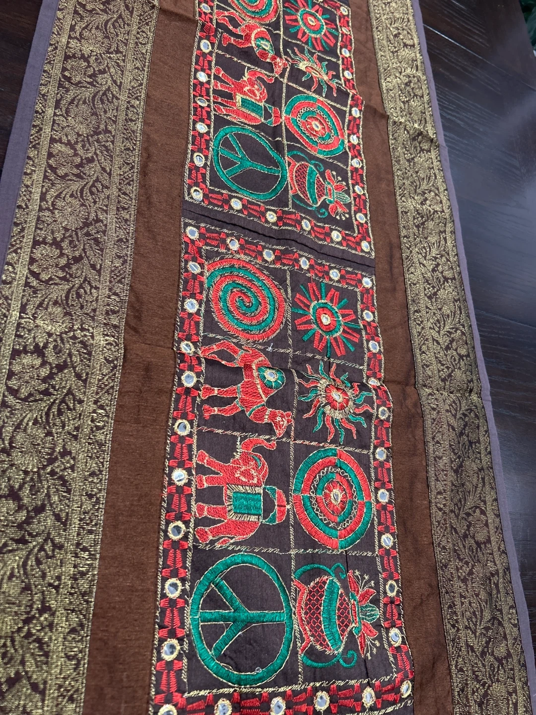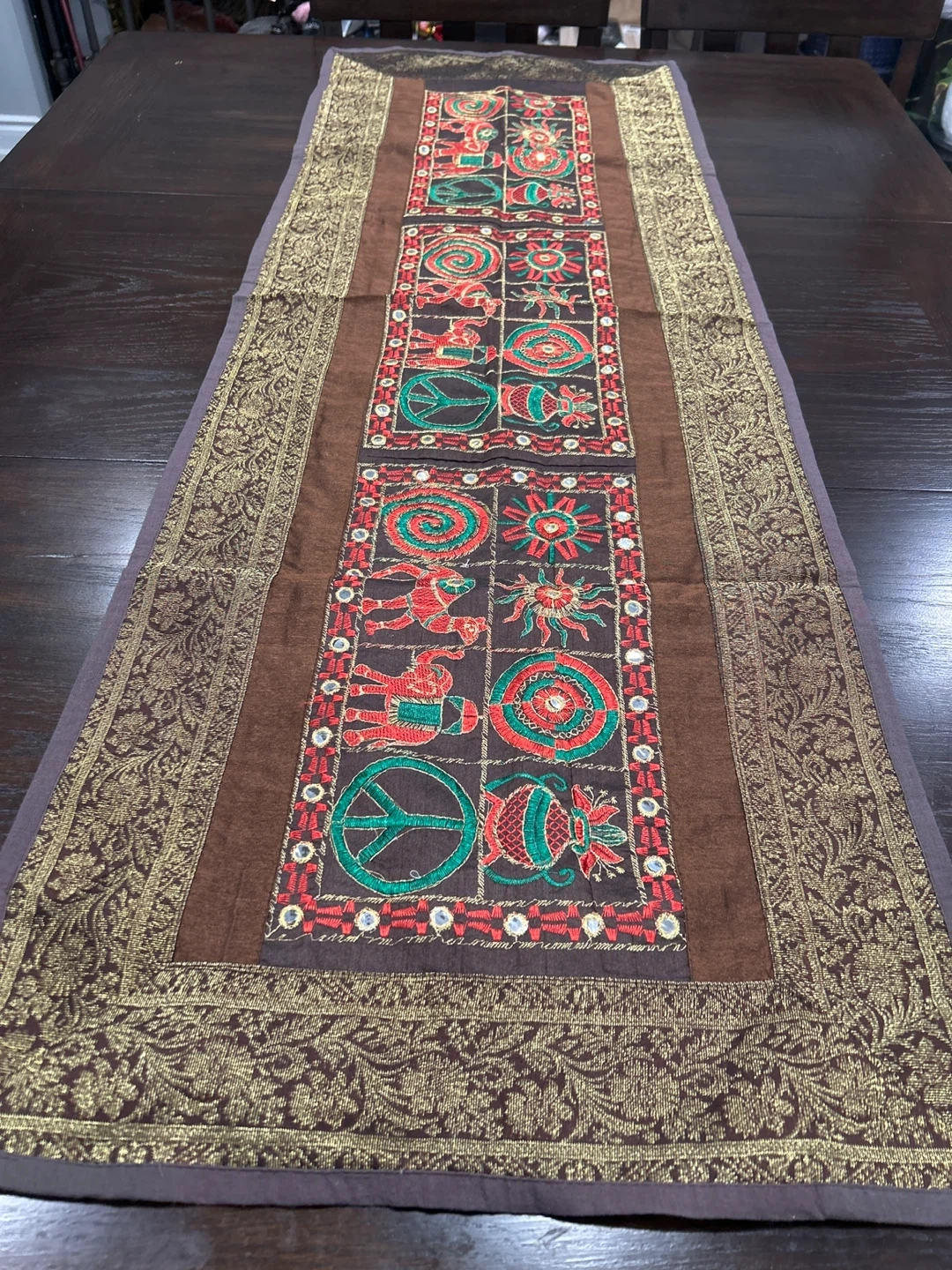 23Beautiful embroidered table runner with a unique design! It features intricate stitching in red, green, and gold on a brown background. Perfect for adding a touch of global style to your dining table or sideboard
