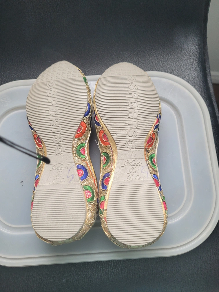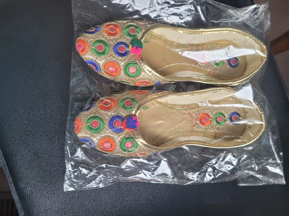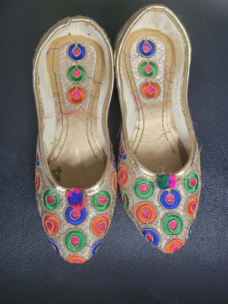 These are a pair of gold-coloured jutti flats with colourful embroidery. They are made in India and are in good condition. Perfect for adding a touch of cultural flair to your outfit!