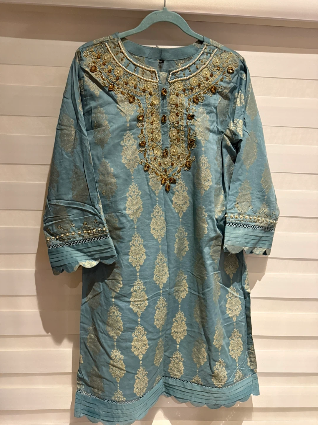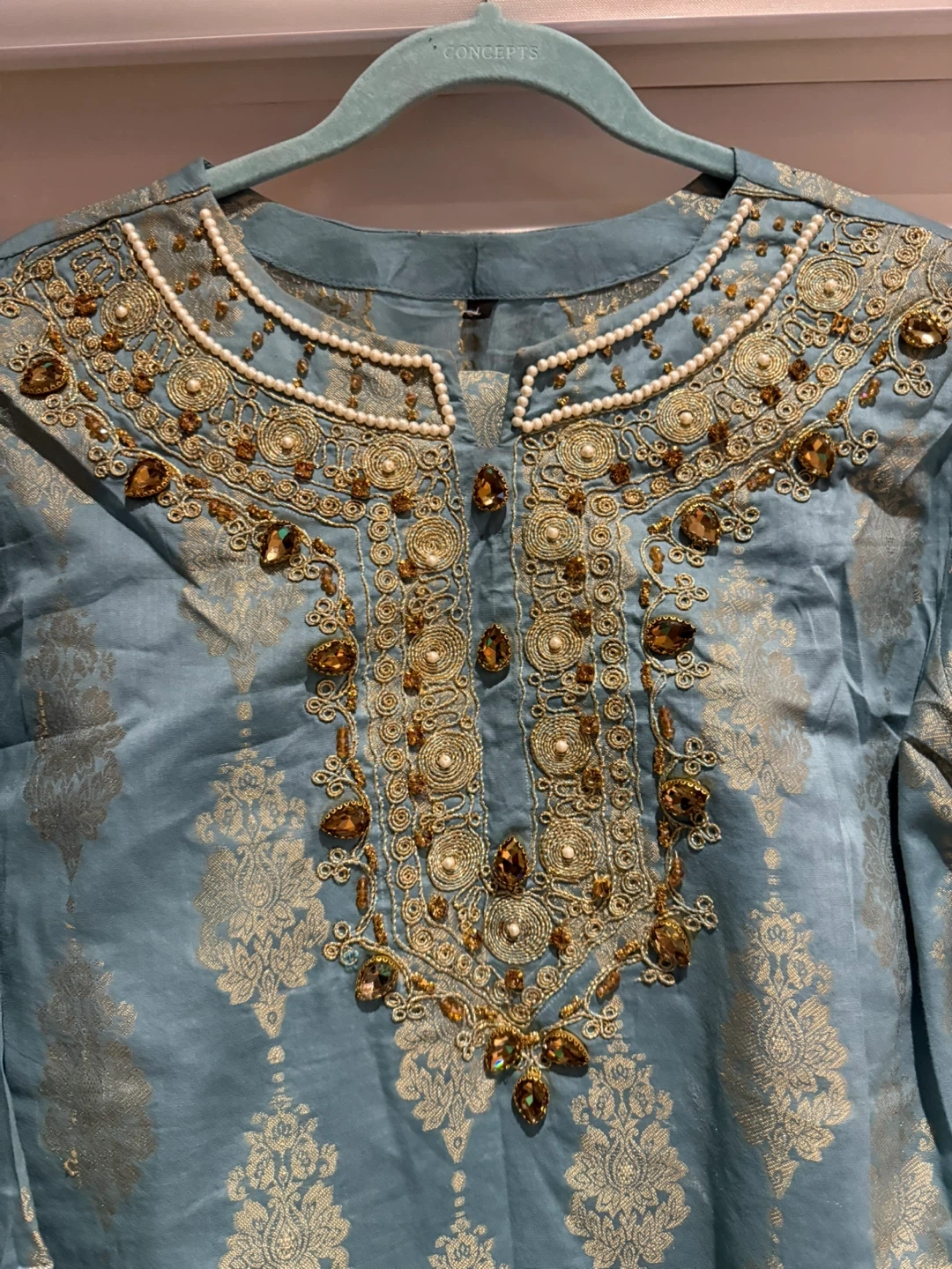 20Beautiful blue kurti with intricate gold embroidery and bead detailing around the neckline. Perfect for a special occasion or adding a touch of elegance to your everyday wear. The material feels soft and comfortable, and the design is truly eye-catching!