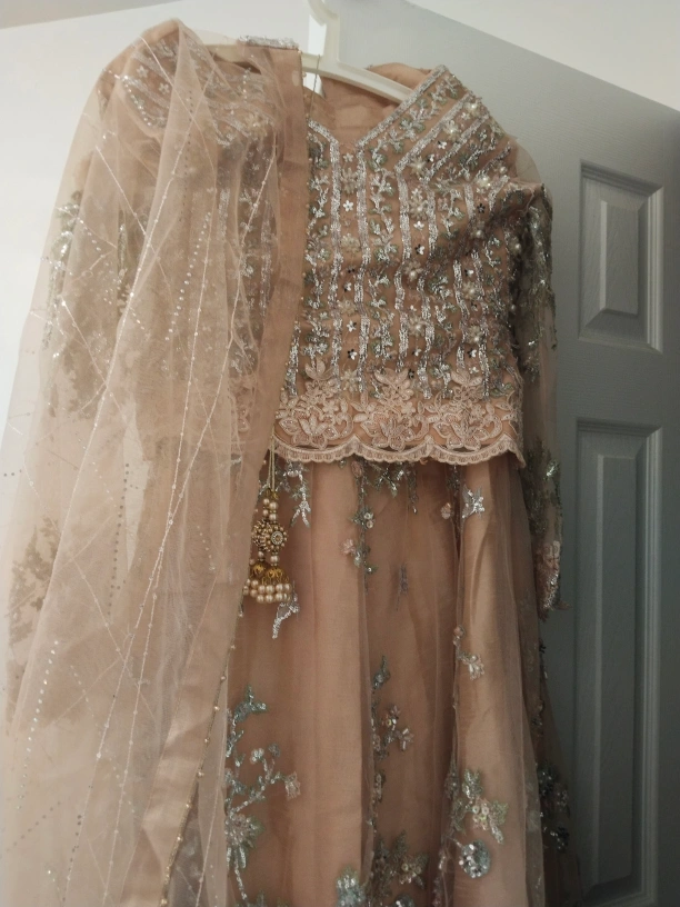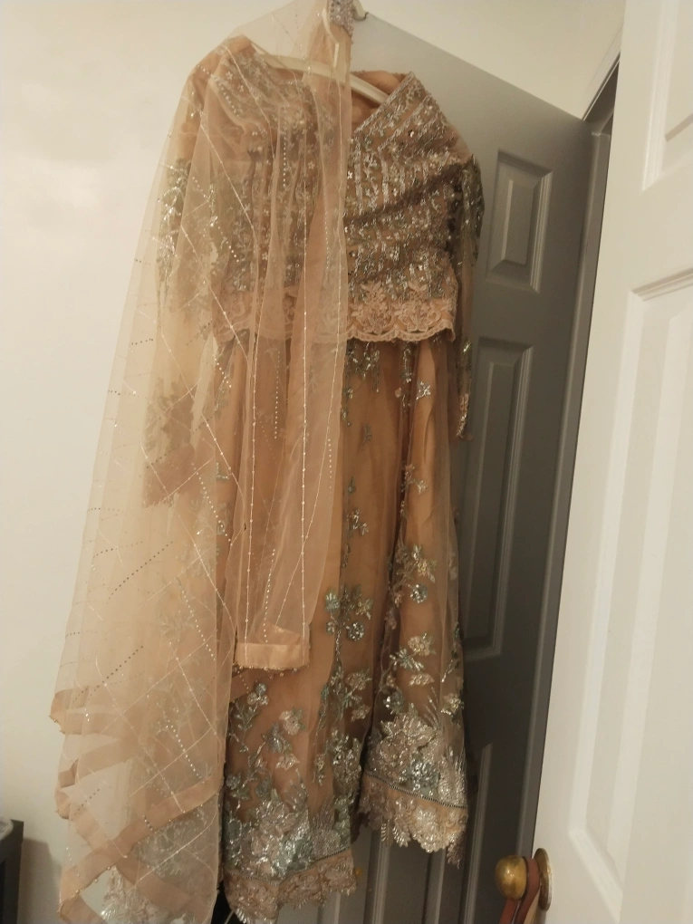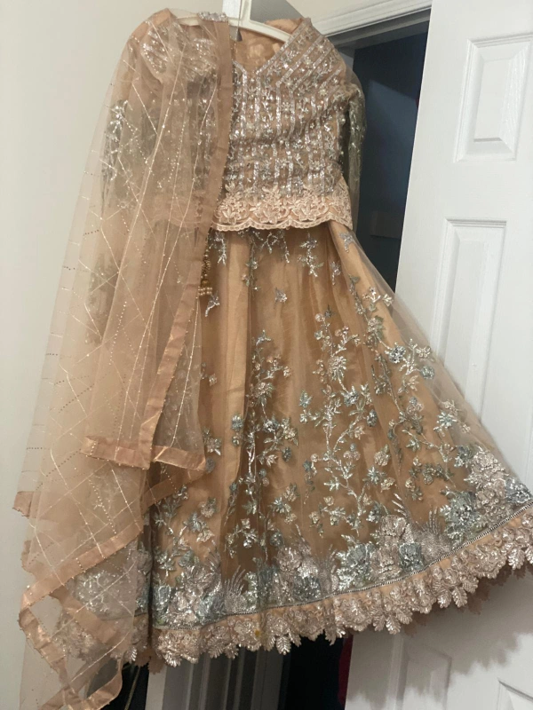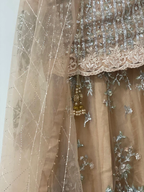 10Beautiful lehenga choli set with intricate embroidery and sequin detailing. The set includes a skirt, top, and dupatta. Perfect for a special occasion!