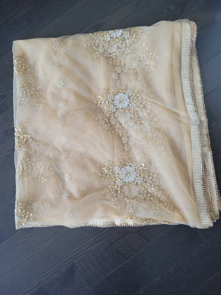 10Selling a beautiful beige and gold embroidered net dupatta. It's in great condition and would be perfect for a special occasion or to add a touch of elegance to any outfit! The delicate embroidery and shimmering gold accents make it a truly eye-catching piece